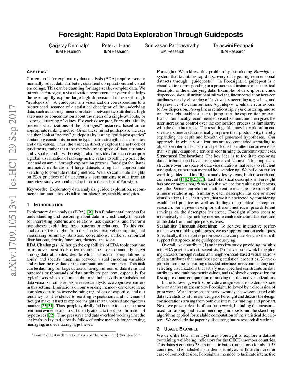 Current tools for exploratory data analysis (EDA) require users to manually select data attributes, statistical computations and visual encodings. This can be daunting for large-scale, complex data. We introduce Foresight, a visualization recommender system that helps the user rapidly explore large high-dimensional datasets through "guideposts." A guidepost is a visualization corresponding to a pronounced instance of a statistical descriptor of the underlying data, such as a strong linear correlation between two attributes, high skewness or concentration about the mean of a single attribute, or a strong clustering of values. For each descriptor, Foresight initially presents visualizations of the "strongest" instances, based on an appropriate ranking metric. Given these initial guideposts, the user can then look at "nearby" guideposts by issuing "guidepost queries" containing constraints on metric type, metric strength, data attributes, and data values. Thus, the user can directly explore the network of guideposts, rather than the overwhelming space of data attributes and visual encodings. Foresight also provides for each descriptor a global visualization of ranking-metric values to both help orient the user and ensure a thorough exploration process. Foresight facilitates interactive exploration of large datasets using fast, approximate sketching to compute ranking metrics. We also contribute insights on EDA practices of data scientists, summarizing results from an interview study we conducted to inform the design of Foresight.