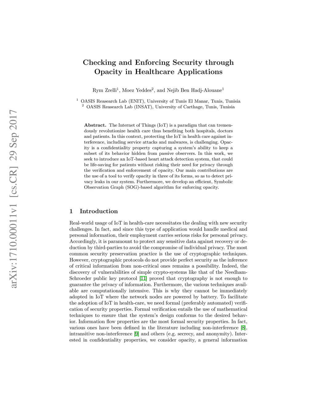 The Internet of Things (IoT) is a paradigm that can tremendously revolutionize health care thus benefiting both hospitals, doctors and patients. In this context, protecting the IoT in health care against interference, including service attacks and malwares, is challenging. Opacity is a confidentiality property capturing a system's ability to keep a subset of its behavior hidden from passive observers. In this work, we seek to introduce an IoT-based heart attack detection system, that could be life-saving for patients without risking their need for privacy through the verification and enforcement of opacity. Our main contributions are the use of a tool to verify opacity in three of its forms, so as to detect privacy leaks in our system. Furthermore, we develop an efficient, Symbolic Observation Graph (SOG)-based algorithm for enforcing opacity.