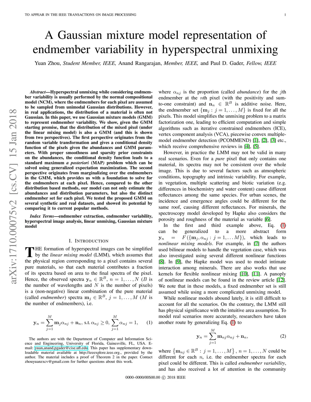 Hyperspectral unmixing while considering endmember variability is usually performed by the normal compositional model (NCM), where the endmembers for each pixel are assumed to be sampled from unimodal Gaussian distributions. However, in real applications, the distribution of a material is often not Gaussian. In this paper, we use Gaussian mixture models (GMM) to represent the endmember variability. We show, given the GMM starting premise, that the distribution of the mixed pixel (under the linear mixing model) is also a GMM (and this is shown from two perspectives). The first perspective originates from the random variable transformation and gives a conditional density function of the pixels given the abundances and GMM parameters. With proper smoothness and sparsity prior constraints on the abundances, the conditional density function leads to a standard maximum a posteriori (MAP) problem which can be solved using generalized expectation maximization. The second perspective originates from marginalizing over the endmembers in the GMM, which provides us with a foundation to solve for the endmembers at each pixel. Hence, our model can not only estimate the abundances and distribution parameters, but also the distinct endmember set for each pixel. We tested the proposed GMM on several synthetic and real datasets, and showed its potential by comparing it to current popular methods.