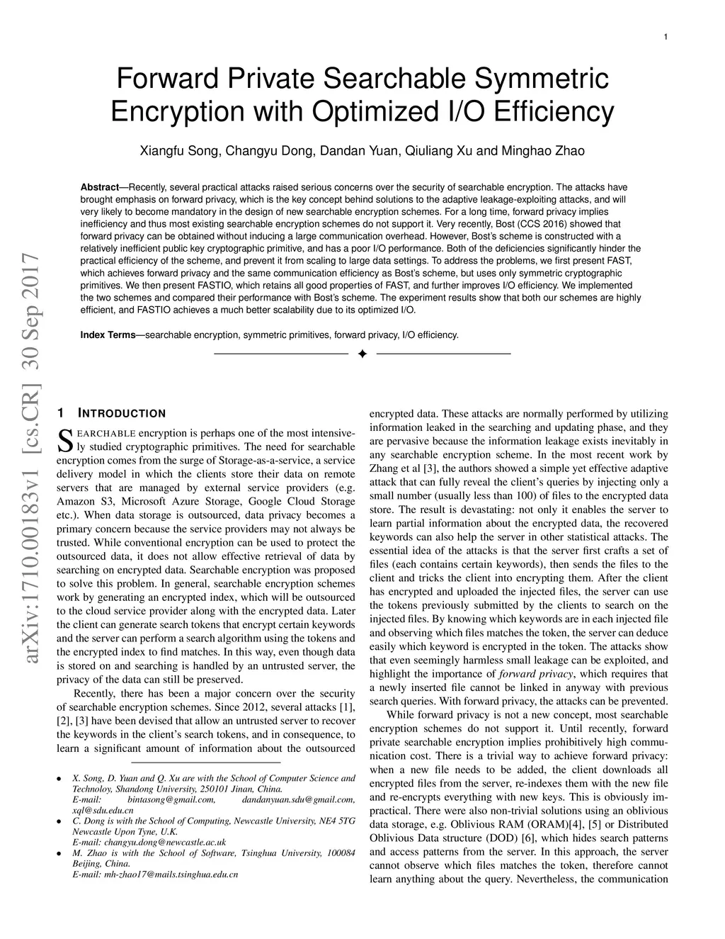 Forward Private Searchable Symmetric Encryption with Optimized I/O