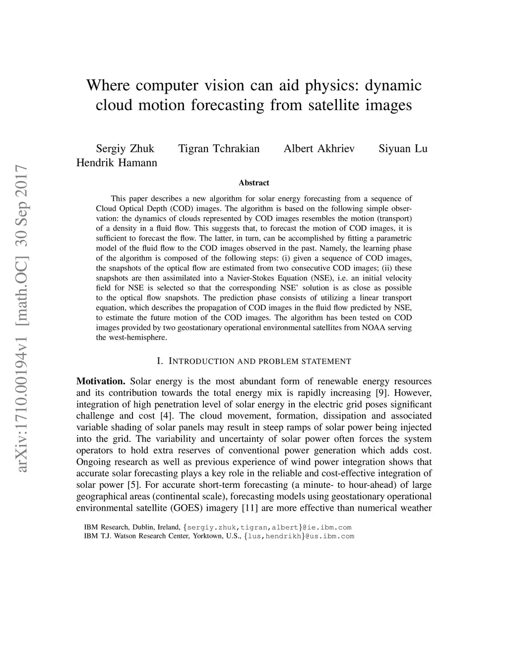 This paper describes a new algorithm for solar energy forecasting from a sequence of Cloud Optical Depth (COD) images. The algorithm is based on the following simple observation: the dynamics of clouds represented by COD images resembles the motion (transport) of a density in a fluid flow. This suggests that, to forecast the motion of COD images, it is sufficient to forecast the flow. The latter, in turn, can be accomplished by fitting a parametric model of the fluid flow to the COD images observed in the past. Namely, the learning phase of the algorithm is composed of the following steps: (i) given a sequence of COD images, the snapshots of the optical flow are estimated from two consecutive COD images; (ii) these snapshots are then assimilated into a Navier-Stokes Equation (NSE), i.e. an initial velocity field for NSE is selected so that the corresponding NSE' solution is as close as possible to the optical flow snapshots. The prediction phase consists of utilizing a linear transport equation, which describes the propagation of COD images in the fluid flow predicted by NSE, to estimate the future motion of the COD images. The algorithm has been tested on COD images provided by two geostationary operational environmental satellites from NOAA serving the west-hemisphere.