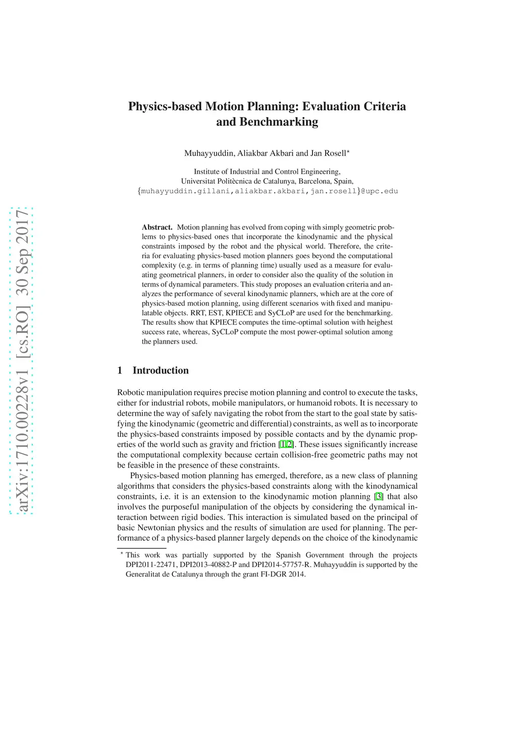 Physics-based Motion Planning: Evaluation Criteria and Benchmarking