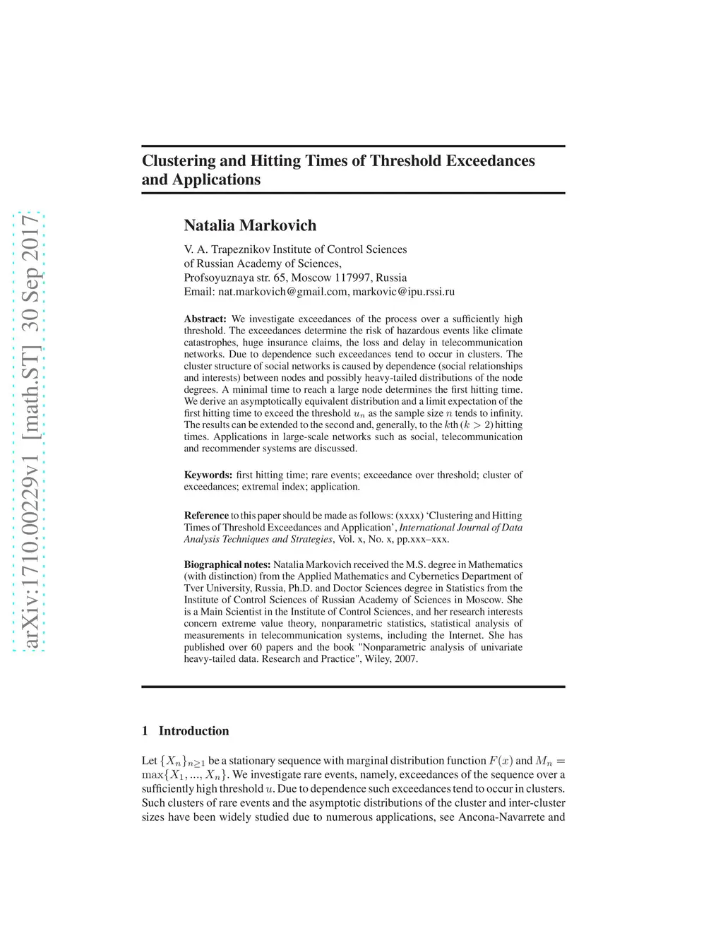 We investigate exceedances of the process over a sufficiently high threshold. The exceedances determine the risk of hazardous events like climate catastrophes, huge insurance claims, the loss and delay in telecommunication networks. Due to dependence such exceedances tend to occur in clusters. The cluster structure of social networks is caused by dependence (social relationships and interests) between nodes and possibly heavy-tailed distributions of the node degrees. A minimal time to reach a large node determines the first hitting time. We derive an asymptotically equivalent distribution and a limit expectation of the first hitting time to exceed the threshold as the sample size tends to infinity. The results can be extended to the second and, generally, to the th () hitting times. Applications in large-scale networks such as social, telecommunication and recommender systems are discussed.