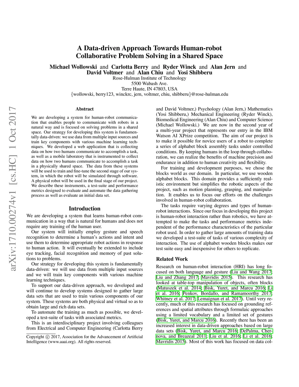 We are developing a system for human-robot communication that enables people to communicate with robots in a natural way and is focused on solving problems in a shared space. Our strategy for developing this system is fundamentally data-driven: we use data from multiple input sources and train key components with various machine learning techniques. We developed a web application that is collecting data on how two humans communicate to accomplish a task, as well as a mobile laboratory that is instrumented to collect data on how two humans communicate to accomplish a task in a physically shared space. The data from these systems will be used to train and fine-tune the second stage of our system, in which the robot will be simulated through software. A physical robot will be used in the final stage of our project. We describe these instruments, a test-suite and performance metrics designed to evaluate and automate the data gathering process as well as evaluate an initial data set.