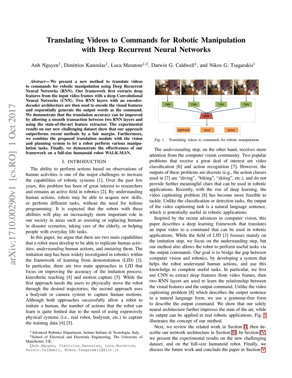 We present a new method to translate videos to commands for robotic manipulation using Deep Recurrent Neural Networks (RNN). Our framework first extracts deep features from the input video frames with a deep Convolutional Neural Networks (CNN). Two RNN layers with an encoder-decoder architecture are then used to encode the visual features and sequentially generate the output words as the command. We demonstrate that the translation accuracy can be improved by allowing a smooth transaction between two RNN layers and using the state-of-the-art feature extractor. The experimental results on our new challenging dataset show that our approach outperforms recent methods by a fair margin. Furthermore, we combine the proposed translation module with the vision and planning system to let a robot perform various manipulation tasks. Finally, we demonstrate the effectiveness of our framework on a full-size humanoid robot WALK-MAN.