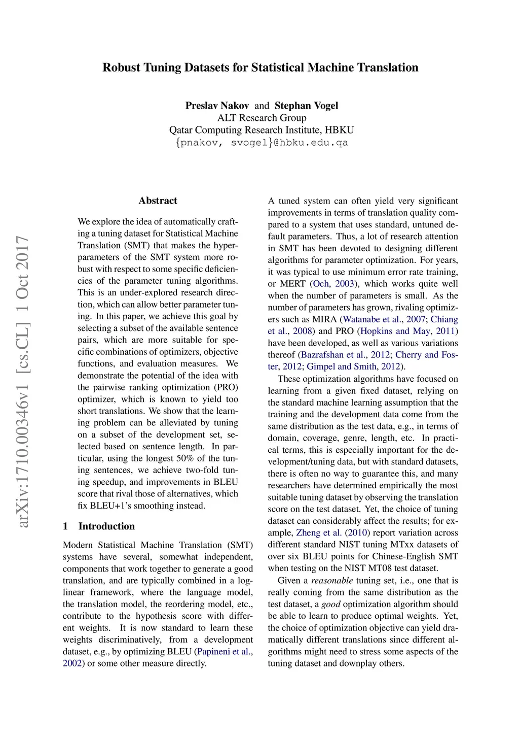 We explore the idea of automatically crafting a tuning dataset for Statistical Machine Translation (SMT) that makes the hyper-parameters of the SMT system more robust with respect to some specific deficiencies of the parameter tuning algorithms. This is an under-explored research direction, which can allow better parameter tuning. In this paper, we achieve this goal by selecting a subset of the available sentence pairs, which are more suitable for specific combinations of optimizers, objective functions, and evaluation measures. We demonstrate the potential of the idea with the pairwise ranking optimization (PRO) optimizer, which is known to yield too short translations. We show that the learning problem can be alleviated by tuning on a subset of the development set, selected based on sentence length. In particular, using the longest 50% of the tuning sentences, we achieve two-fold tuning speedup, and improvements in BLEU score that rival those of alternatives, which fix BLEU+1's smoothing instead.