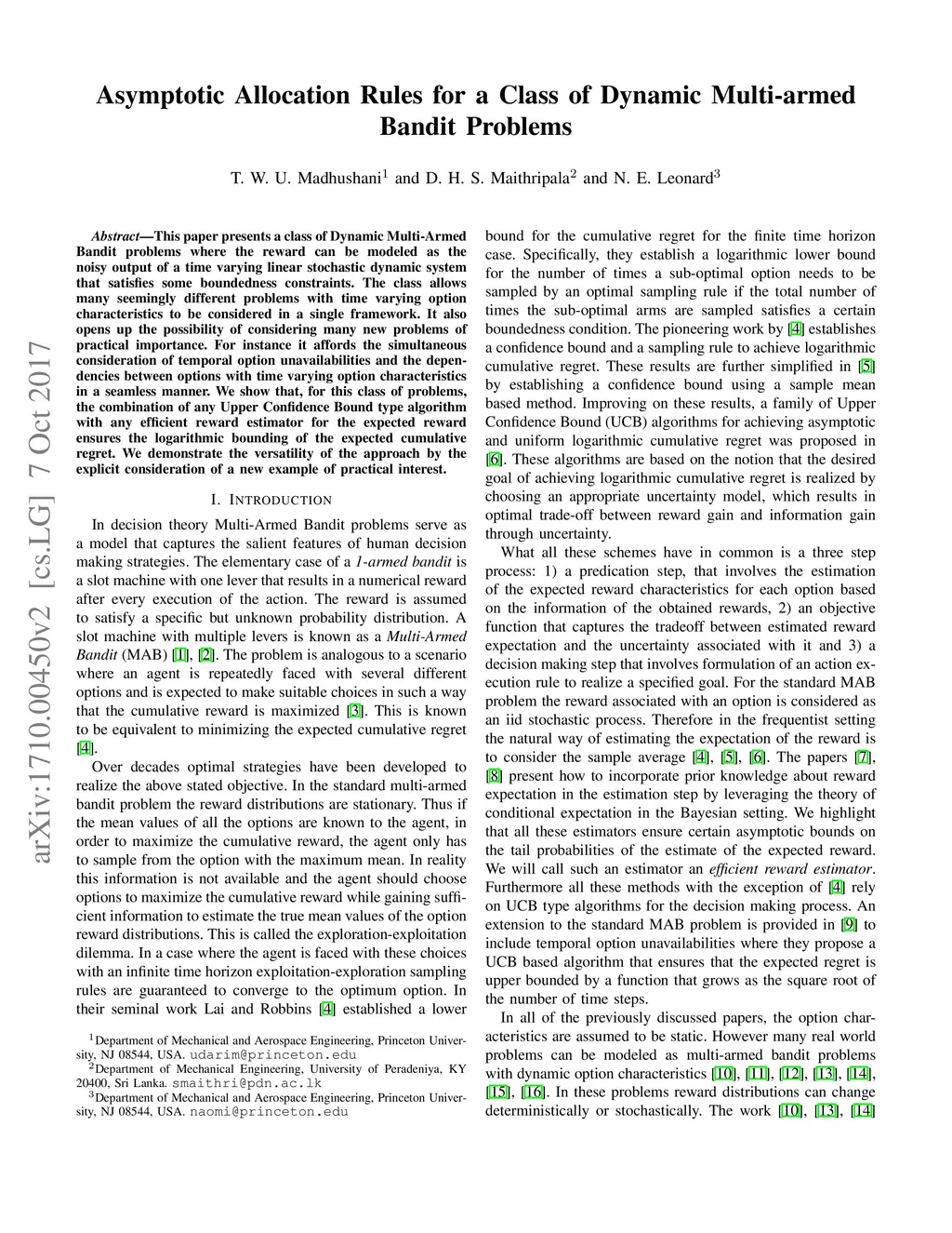 This paper presents a class of Dynamic Multi-Armed Bandit problems where the reward can be modeled as the noisy output of a time varying linear stochastic dynamic system that satisfies some boundedness constraints. The class allows many seemingly different problems with time varying option characteristics to be considered in a single framework. It also opens up the possibility of considering many new problems of practical importance. For instance it affords the simultaneous consideration of temporal option unavailabilities and the depen- dencies between options with time varying option characteristics in a seamless manner. We show that, for this class of problems, the combination of any Upper Confidence Bound type algorithm with any efficient reward estimator for the expected reward ensures the logarithmic bounding of the expected cumulative regret. We demonstrate the versatility of the approach by the explicit consideration of a new example of practical interest.