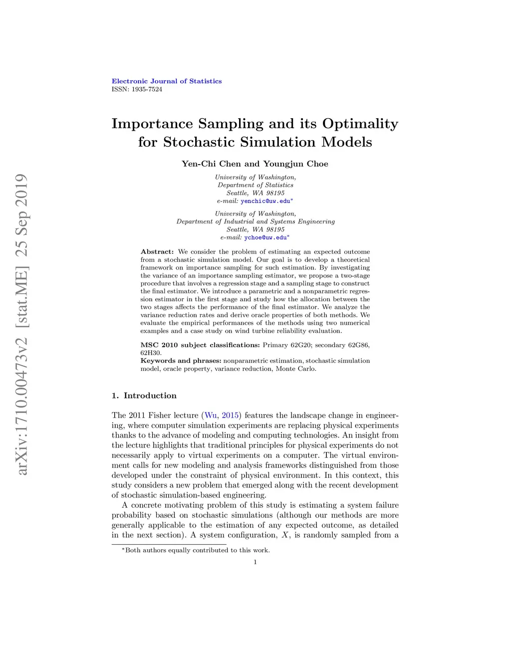 We consider the problem of estimating an expected outcome from a stochastic simulation model. Our goal is to develop a theoretical framework on importance sampling for such estimation. By investigating the variance of an importance sampling estimator, we propose a two-stage procedure that involves a regression stage and a sampling stage to construct the final estimator. We introduce a parametric and a nonparametric regression estimator in the first stage and study how the allocation between the two stages affects the performance of the final estimator. We analyze the variance reduction rates and derive oracle properties of both methods. We evaluate the empirical performances of the methods using two numerical examples and a case study on wind turbine reliability evaluation.
