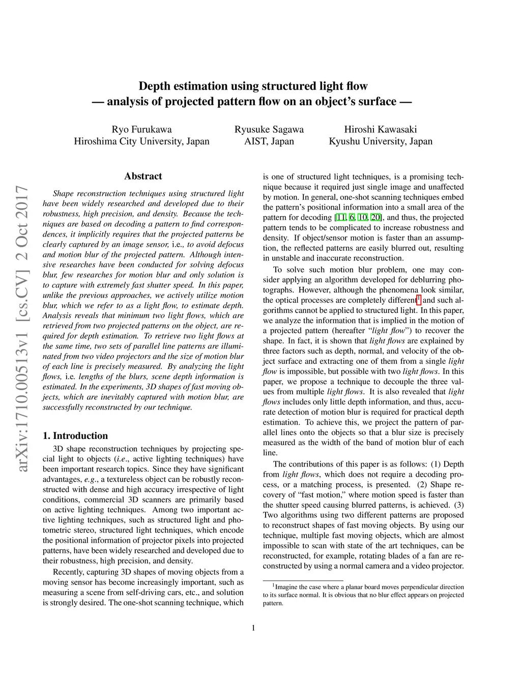 Shape reconstruction techniques using structured light have been widely researched and developed due to their robustness, high precision, and density. Because the techniques are based on decoding a pattern to find correspondences, it implicitly requires that the projected patterns be clearly captured by an image sensor, i.e., to avoid defocus and motion blur of the projected pattern. Although intensive researches have been conducted for solving defocus blur, few researches for motion blur and only solution is to capture with extremely fast shutter speed. In this paper, unlike the previous approaches, we actively utilize motion blur, which we refer to as a light flow, to estimate depth. Analysis reveals that minimum two light flows, which are retrieved from two projected patterns on the object, are required for depth estimation. To retrieve two light flows at the same time, two sets of parallel line patterns are illuminated from two video projectors and the size of motion blur of each line is precisely measured. By analyzing the light flows, i.e. lengths of the blurs, scene depth information is estimated. In the experiments, 3D shapes of fast moving objects, which are inevitably captured with motion blur, are successfully reconstructed by our technique.