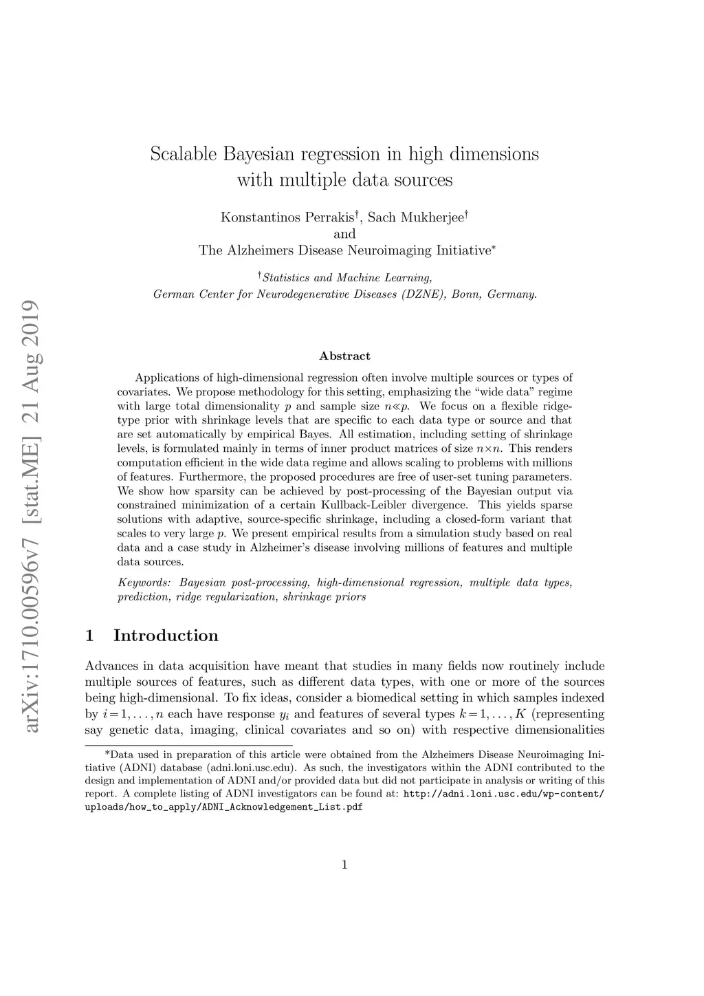 Applications of high-dimensional regression often involve multiple sources or types of covariates. We propose methodology for this setting, emphasizing the "wide data" regime with large total dimensionality p and sample size n<<p. We focus on a flexible ridge-type prior with shrinkage levels that are specific to each data type or source and that are set automatically by empirical Bayes. All estimation, including setting of shrinkage levels, is formulated mainly in terms of inner product matrices of size n x n. This renders computation efficient in the wide data regime and allows scaling to problems with millions of features. Furthermore, the proposed procedures are free of user-set tuning parameters. We show how sparsity can be achieved by post-processing of the Bayesian output via constrained minimization of a certain Kullback-Leibler divergence. This yields sparse solutions with adaptive, source-specific shrinkage, including a closed-form variant that scales to very large p. We present empirical results from a simulation study based on real data and a case study in Alzheimer's disease involving millions of features and multiple data sources.