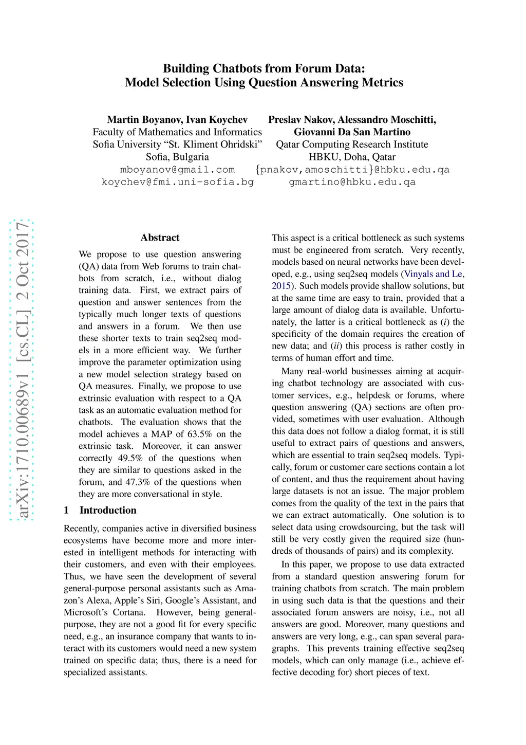 We propose to use question answering (QA) data from Web forums to train chatbots from scratch, i.e., without dialog training data. First, we extract pairs of question and answer sentences from the typically much longer texts of questions and answers in a forum. We then use these shorter texts to train seq2seq models in a more efficient way. We further improve the parameter optimization using a new model selection strategy based on QA measures. Finally, we propose to use extrinsic evaluation with respect to a QA task as an automatic evaluation method for chatbots. The evaluation shows that the model achieves a MAP of 63.5% on the extrinsic task. Moreover, it can answer correctly 49.5% of the questions when they are similar to questions asked in the forum, and 47.3% of the questions when they are more conversational in style.