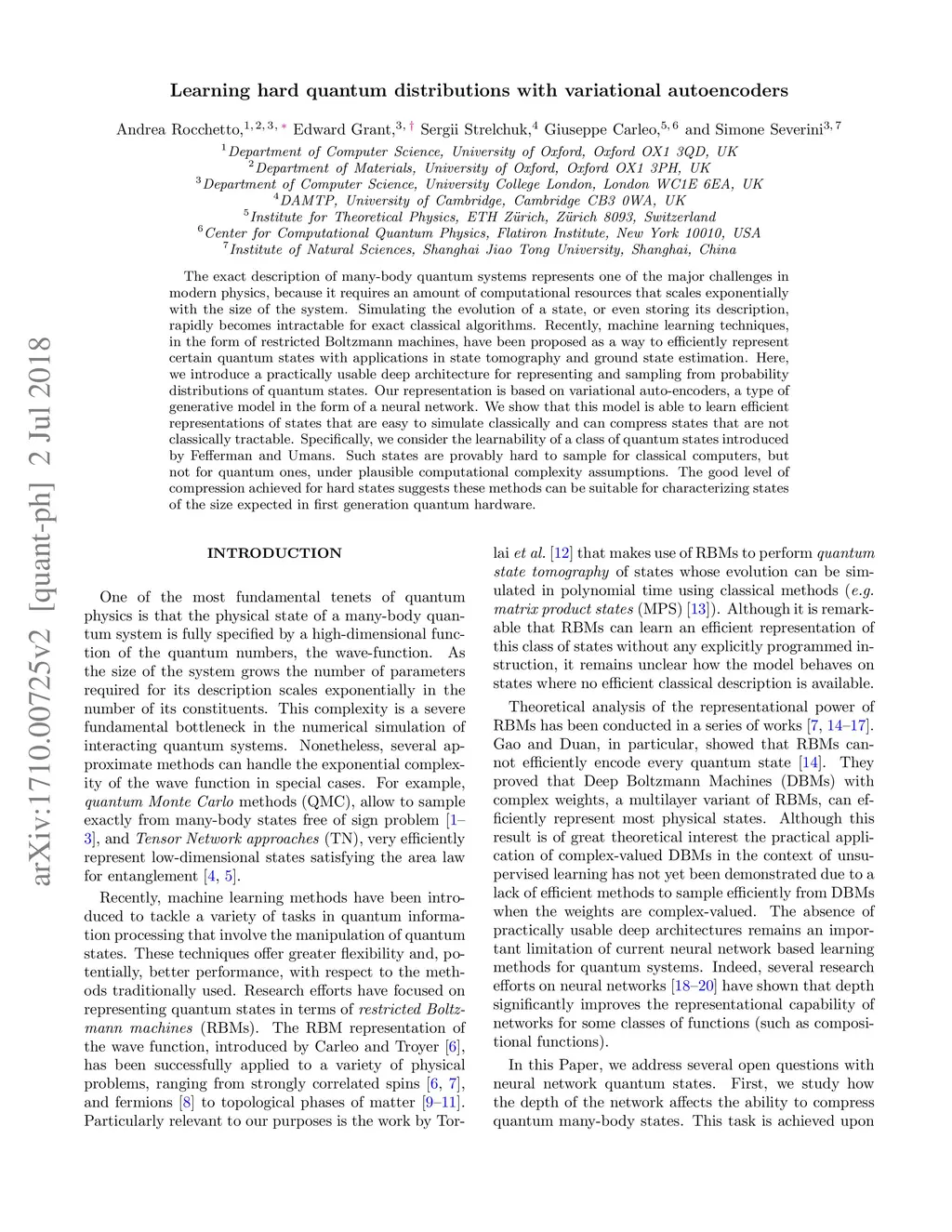 Studying general quantum many-body systems is one of the major challenges in modern physics because it requires an amount of computational resources that scales exponentially with the size of the system.Simulating the evolution of a state, or even storing its description, rapidly becomes intractable for exact classical algorithms. Recently, machine learning techniques, in the form of restricted Boltzmann machines, have been proposed as a way to efficiently represent certain quantum states with applications in state tomography and ground state estimation. Here, we introduce a new representation of states based on variational autoencoders. Variational autoencoders are a type of generative model in the form of a neural network. We probe the power of this representation by encoding probability distributions associated with states from different classes. Our simulations show that deep networks give a better representation for states that are hard to sample from, while providing no benefit for random states. This suggests that the probability distributions associated to hard quantum states might have a compositional structure that can be exploited by layered neural networks. Specifically, we consider the learnability of a class of quantum states introduced by Fefferman and Umans. Such states are provably hard to sample for classical computers, but not for quantum ones, under plausible computational complexity assumptions. The good level of compression achieved for hard states suggests these methods can be suitable for characterising states of the size expected in first generation quantum hardware.
