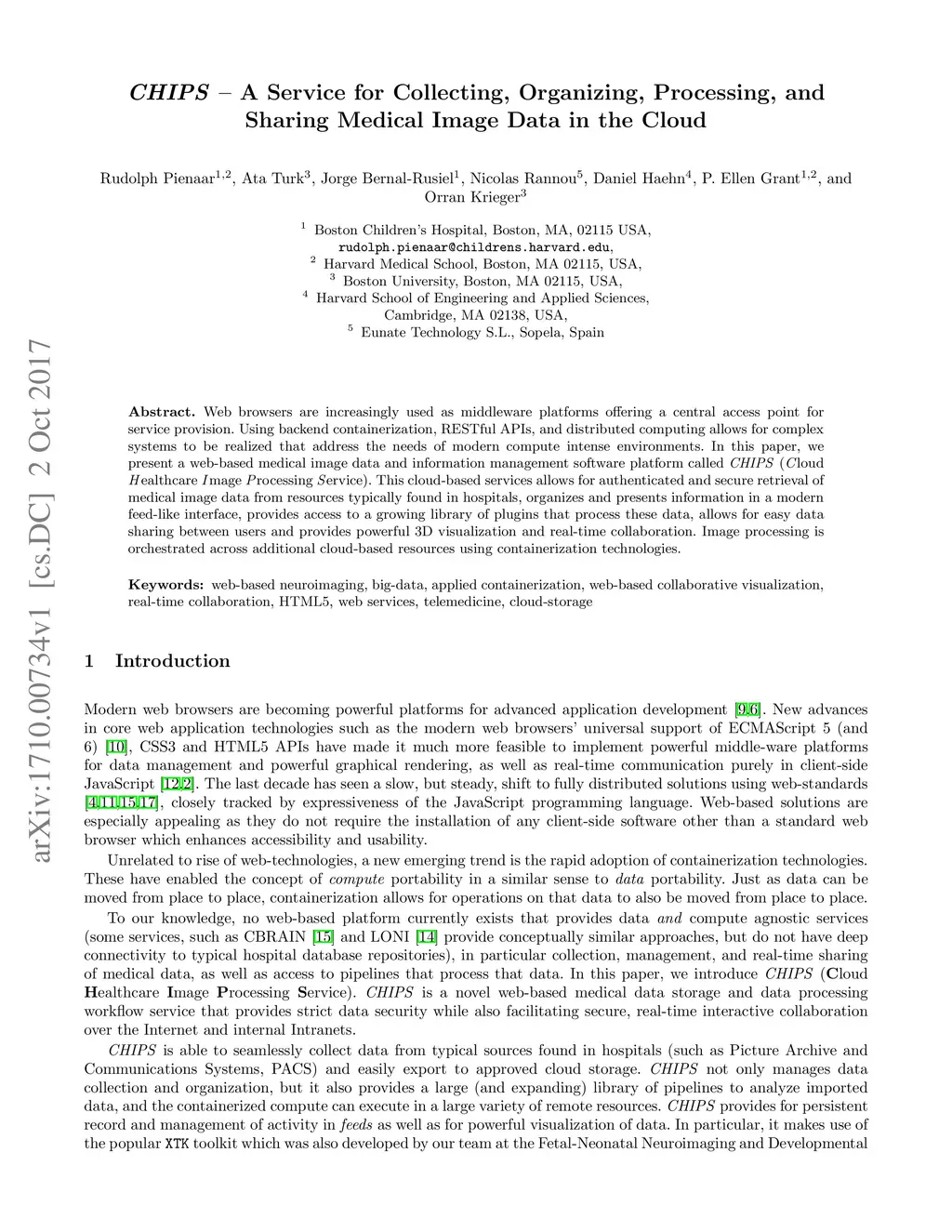 Web browsers are increasingly used as middleware platforms offering a central access point for service provision. Using backend containerization, RESTful APIs, and distributed computing allows for complex systems to be realized that address the needs of modern compute intense environments. In this paper, we present a web-based medical image data and information management software platform called CHIPS (Cloud Healthcare Image Processing Service). This cloud-based services allows for authenticated and secure retrieval of medical image data from resources typically found in hospitals, organizes and presents information in a modern feed-like interface, provides access to a growing library of plugins that process these data, allows for easy data sharing between users and provides powerful 3D visualization and real-time collaboration. Image processing is orchestrated across additional cloud-based resources using containerization technologies.