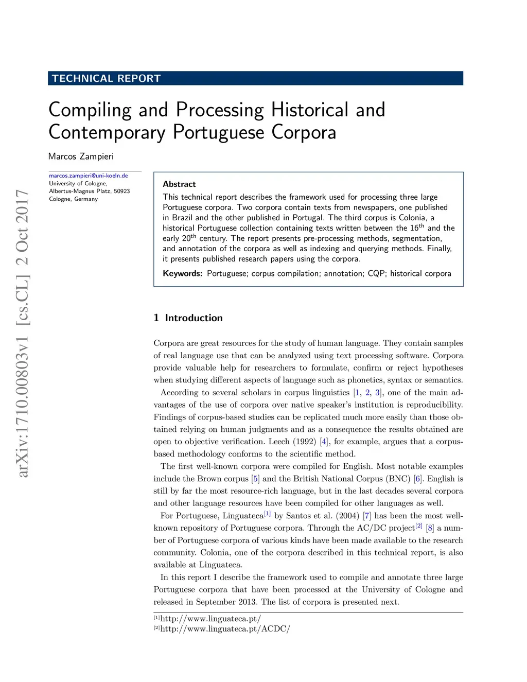 This technical report describes the framework used for processing three large Portuguese corpora. Two corpora contain texts from newspapers, one published in Brazil and the other published in Portugal. The third corpus is Colonia, a historical Portuguese collection containing texts written between the 16th and the early 20th century. The report presents pre-processing methods, segmentation, and annotation of the corpora as well as indexing and querying methods. Finally, it presents published research papers using the corpora.