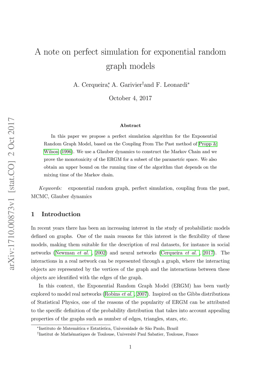 In this paper we propose a perfect simulation algorithm for the Exponential Random Graph Model, based on the Coupling From The Past method of Propp & Wilson (1996). We use a Glauber dynamics to construct the Markov Chain and we prove the monotonicity of the ERGM for a subset of the parametric space. We also obtain an upper bound on the running time of the algorithm that depends on the mixing time of the Markov chain.
