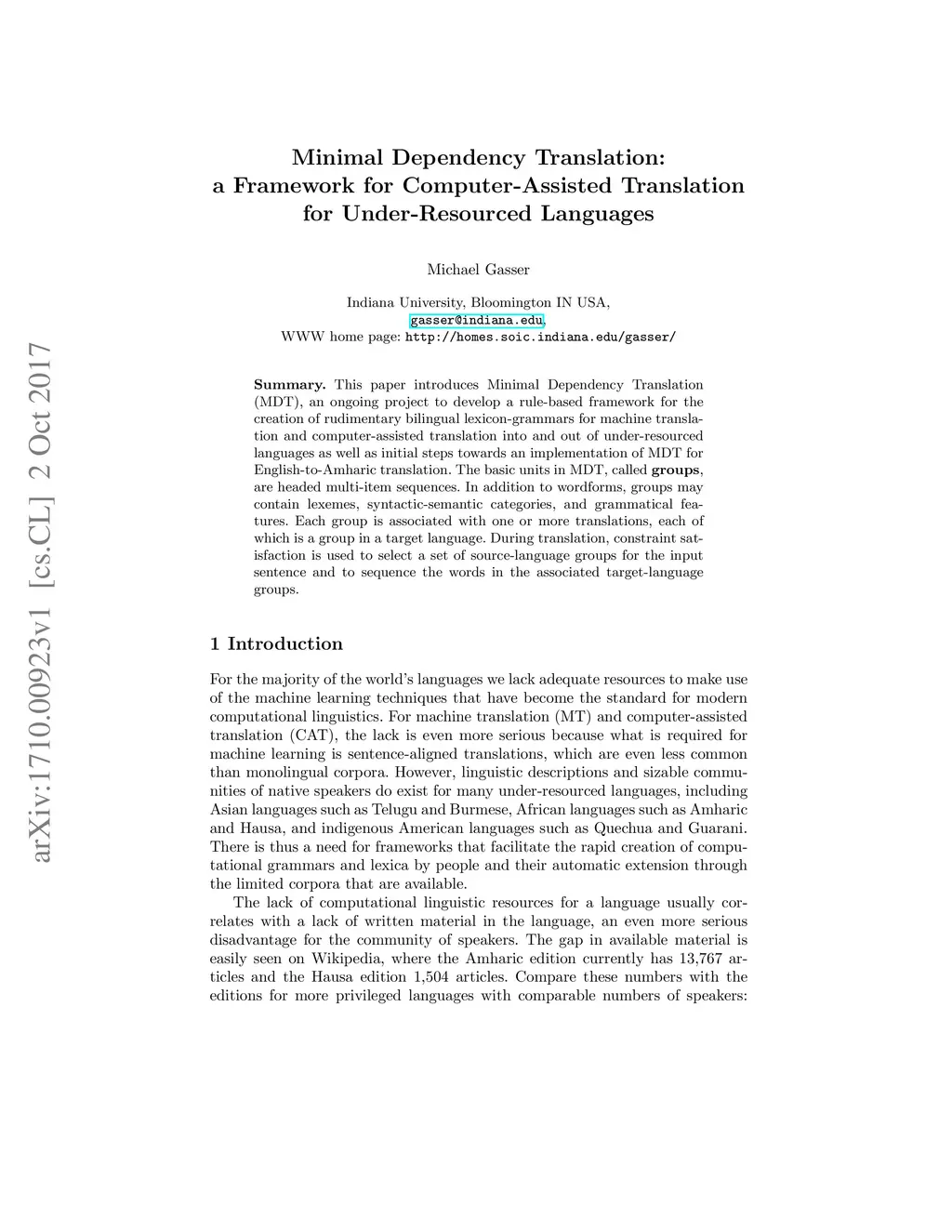 This paper introduces Minimal Dependency Translation (MDT), an ongoing project to develop a rule-based framework for the creation of rudimentary bilingual lexicon-grammars for machine translation and computer-assisted translation into and out of under-resourced languages as well as initial steps towards an implementation of MDT for English-to-Amharic translation. The basic units in MDT, called groups, are headed multi-item sequences. In addition to wordforms, groups may contain lexemes, syntactic-semantic categories, and grammatical features. Each group is associated with one or more translations, each of which is a group in a target language. During translation, constraint satisfaction is used to select a set of source-language groups for the input sentence and to sequence the words in the associated target-language groups.