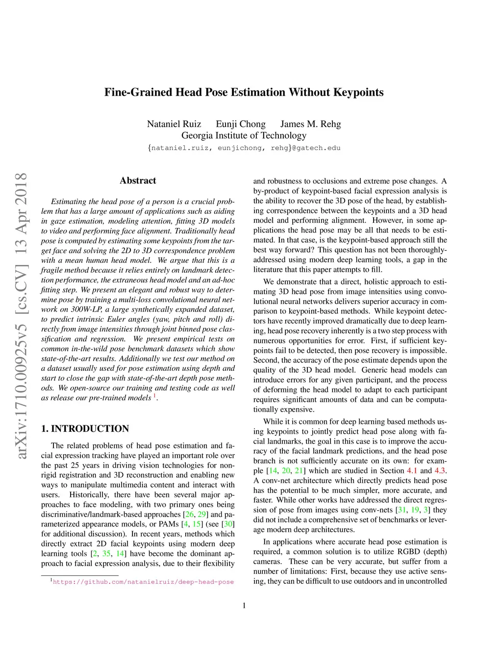 Estimating the head pose of a person is a crucial problem that has a large amount of applications such as aiding in gaze estimation, modeling attention, fitting 3D models to video and performing face alignment. Traditionally head pose is computed by estimating some keypoints from the target face and solving the 2D to 3D correspondence problem with a mean human head model. We argue that this is a fragile method because it relies entirely on landmark detection performance, the extraneous head model and an ad-hoc fitting step. We present an elegant and robust way to determine pose by training a multi-loss convolutional neural network on 300W-LP, a large synthetically expanded dataset, to predict intrinsic Euler angles (yaw, pitch and roll) directly from image intensities through joint binned pose classification and regression. We present empirical tests on common in-the-wild pose benchmark datasets which show state-of-the-art results. Additionally we test our method on a dataset usually used for pose estimation using depth and start to close the gap with state-of-the-art depth pose methods. We open-source our training and testing code as well as release our pre-trained models.