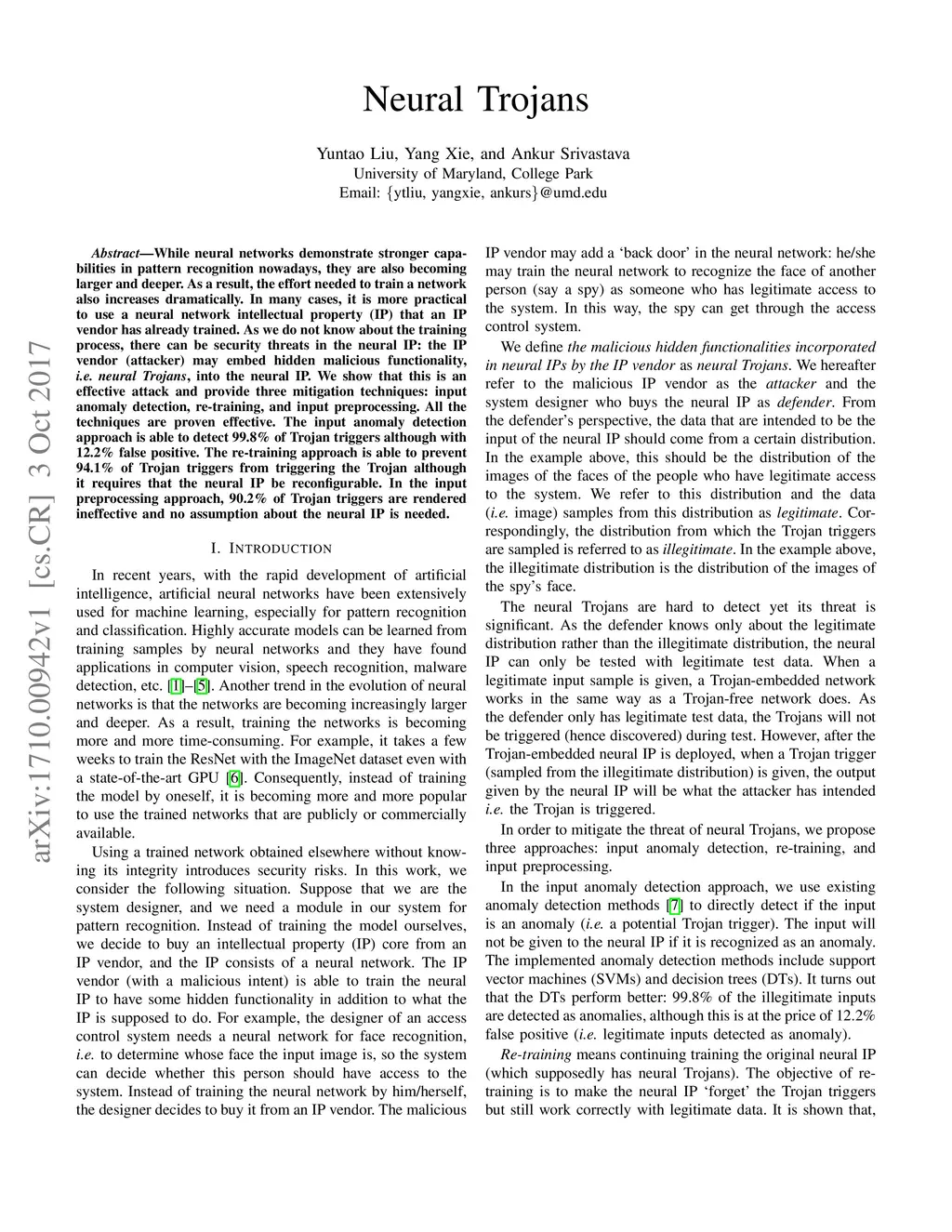 While neural networks demonstrate stronger capabilities in pattern recognition nowadays, they are also becoming larger and deeper. As a result, the effort needed to train a network also increases dramatically. In many cases, it is more practical to use a neural network intellectual property (IP) that an IP vendor has already trained. As we do not know about the training process, there can be security threats in the neural IP: the IP vendor (attacker) may embed hidden malicious functionality, i.e. neural Trojans, into the neural IP. We show that this is an effective attack and provide three mitigation techniques: input anomaly detection, re-training, and input preprocessing. All the techniques are proven effective. The input anomaly detection approach is able to detect 99.8% of Trojan triggers although with 12.2% false positive. The re-training approach is able to prevent 94.1% of Trojan triggers from triggering the Trojan although it requires that the neural IP be reconfigurable. In the input preprocessing approach, 90.2% of Trojan triggers are rendered ineffective and no assumption about the neural IP is needed.