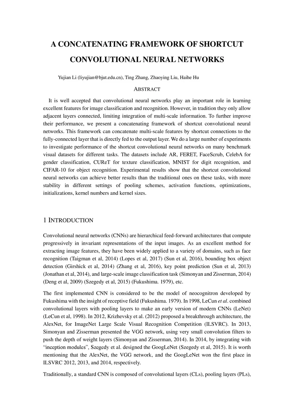 It is well accepted that convolutional neural networks play an important role in learning excellent features for image classification and recognition. However, in tradition they only allow adjacent layers connected, limiting integration of multi-scale information. To further improve their performance, we present a concatenating framework of shortcut convolutional neural networks. This framework can concatenate multi-scale features by shortcut connections to the fully-connected layer that is directly fed to the output layer. We do a large number of experiments to investigate performance of the shortcut convolutional neural networks on many benchmark visual datasets for different tasks. The datasets include AR, FERET, FaceScrub, CelebA for gender classification, CUReT for texture classification, MNIST for digit recognition, and CIFAR-10 for object recognition. Experimental results show that the shortcut convolutional neural networks can achieve better results than the traditional ones on these tasks, with more stability in different settings of pooling schemes, activation functions, optimizations, initializations, kernel numbers and kernel sizes.