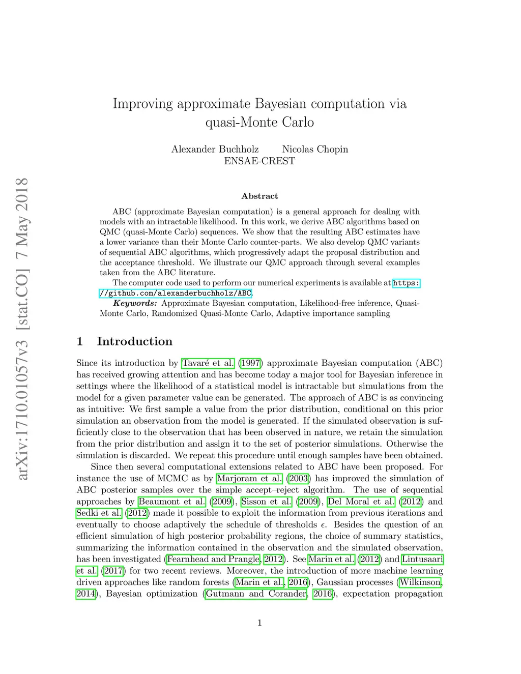 ABC (approximate Bayesian computation) is a general approach for dealing with models with an intractable likelihood. In this work, we derive ABC algorithms based on QMC (quasi- Monte Carlo) sequences. We show that the resulting ABC estimates have a lower variance than their Monte Carlo counter-parts. We also develop QMC variants of sequential ABC algorithms, which progressively adapt the proposal distribution and the acceptance threshold. We illustrate our QMC approach through several examples taken from the ABC literature. Keywords: Approximate Bayesian computation, Likelihood-free inference, Quasi Monte Carlo, Randomized Quasi-Monte Carlo, Adaptive importance sampling