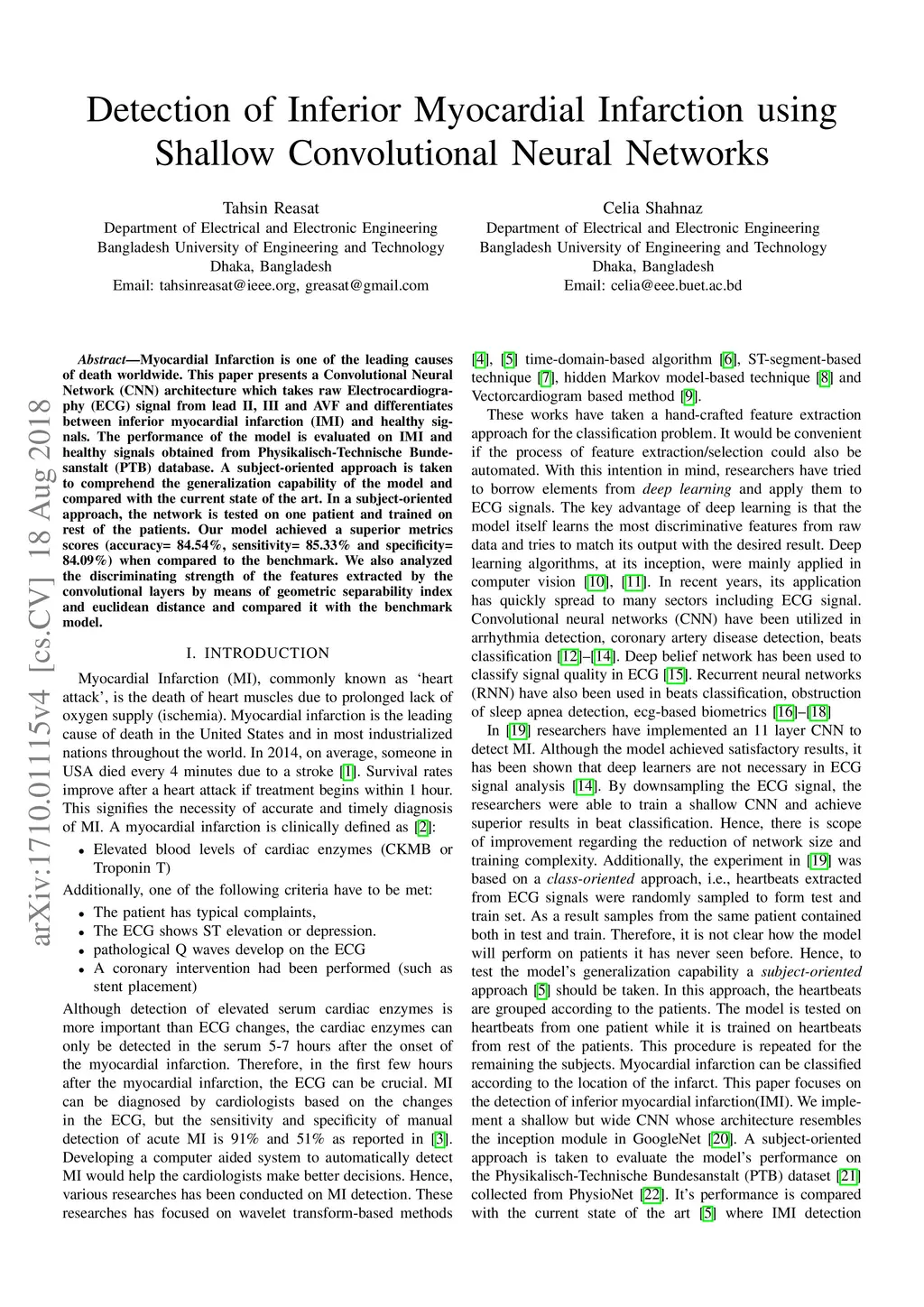 Detection of Inferior Myocardial Infarction using Shallow Convolutional