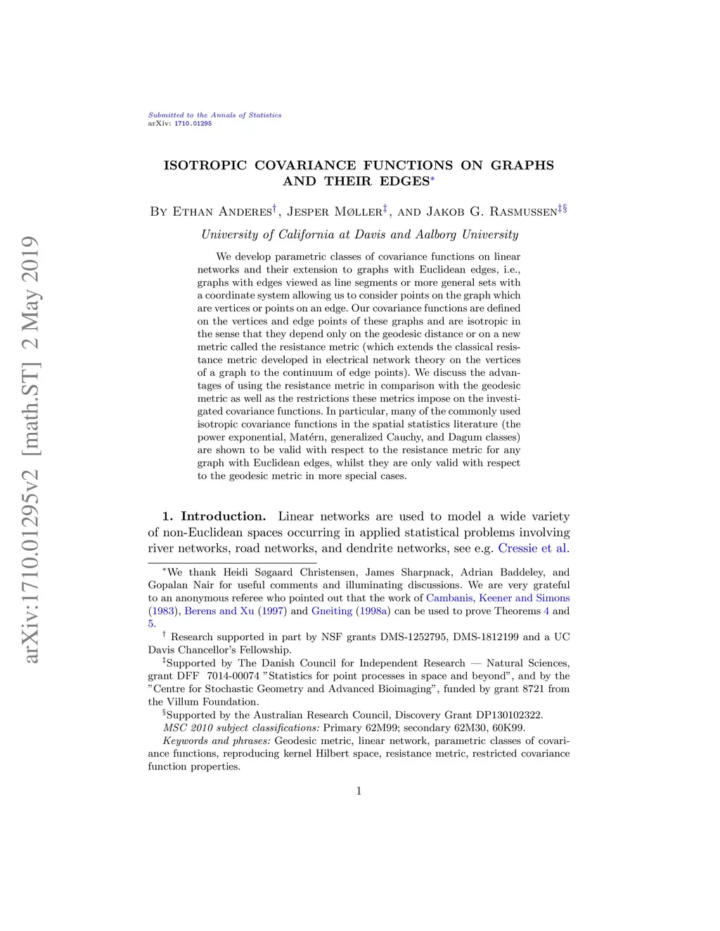 We develop parametric classes of covariance functions on linear networks and their extension to graphs with Euclidean edges, i.e., graphs with edges viewed as line segments or more general sets with a coordinate system allowing us to consider points on the graph which are vertices or points on an edge. Our covariance functions are defined on the vertices and edge points of these graphs and are isotropic in the sense that they depend only on the geodesic distance or on a new metric called the resistance metric (which extends the classical resistance metric developed in electrical network theory on the vertices of a graph to the continuum of edge points). We discuss the advantages of using the resistance metric in comparison with the geodesic metric as well as the restrictions these metrics impose on the investigated covariance functions. In particular, many of the commonly used isotropic covariance functions in the spatial statistics literature (the power exponential, Mat{\é}rn, generalized Cauchy, and Dagum classes) are shown to be valid with respect to the resistance metric for any graph with Euclidean edges, whilst they are only valid with respect to the geodesic metric in more special cases.