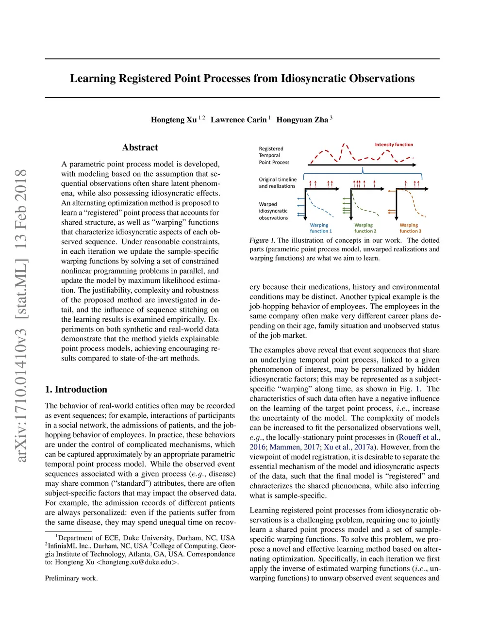 A parametric point process model is developed, with modeling based on the assumption that sequential observations often share latent phenomena, while also possessing idiosyncratic effects. An alternating optimization method is proposed to learn a "registered" point process that accounts for shared structure, as well as "warping" functions that characterize idiosyncratic aspects of each observed sequence. Under reasonable constraints, in each iteration we update the sample-specific warping functions by solving a set of constrained nonlinear programming problems in parallel, and update the model by maximum likelihood estimation. The justifiability, complexity and robustness of the proposed method are investigated in detail, and the influence of sequence stitching on the learning results is examined empirically. Experiments on both synthetic and real-world data demonstrate that the method yields explainable point process models, achieving encouraging results compared to state-of-the-art methods.