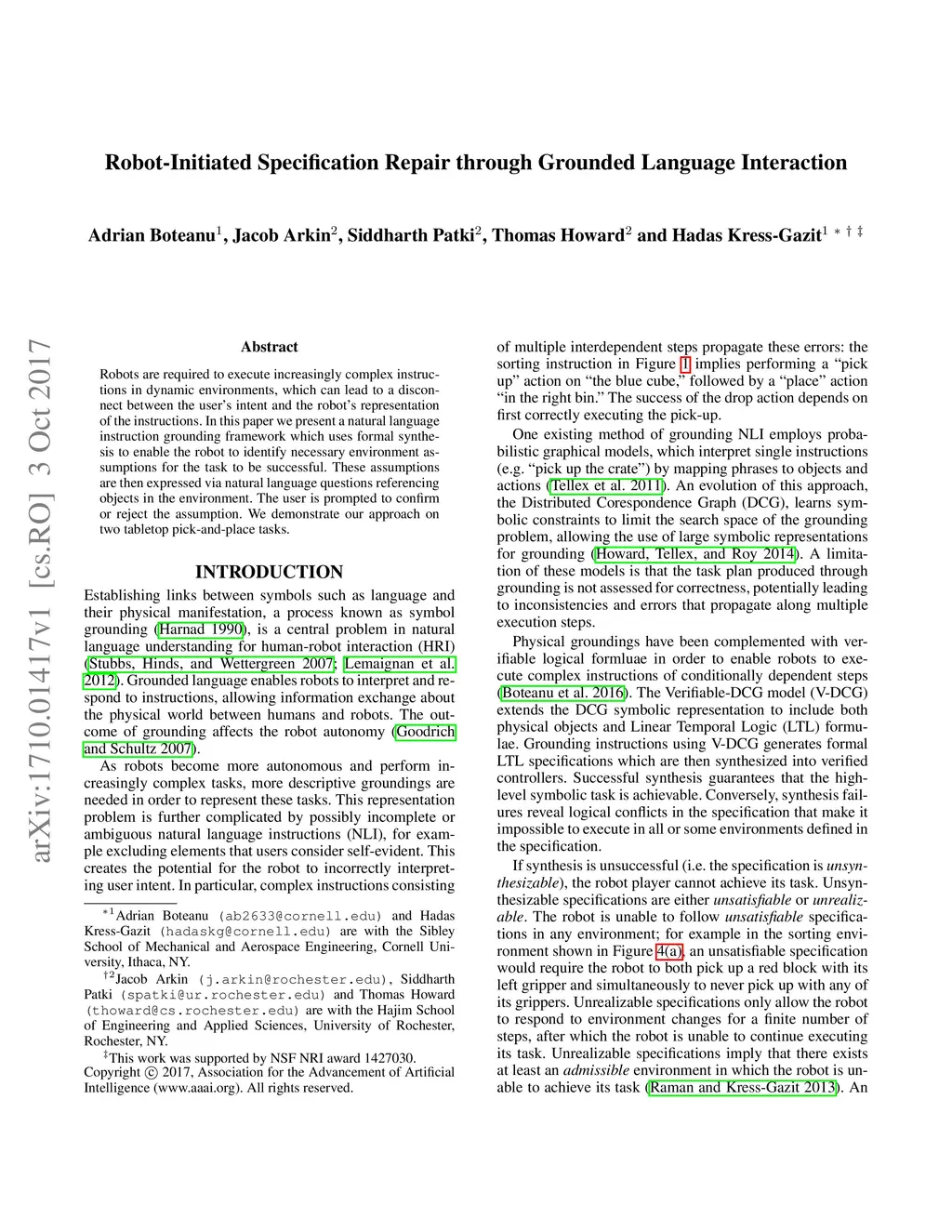 Robots are required to execute increasingly complex instructions in dynamic environments, which can lead to a disconnect between the user's intent and the robot's representation of the instructions. In this paper we present a natural language instruction grounding framework which uses formal synthesis to enable the robot to identify necessary environment assumptions for the task to be successful. These assumptions are then expressed via natural language questions referencing objects in the environment. The user is prompted to confirm or reject the assumption. We demonstrate our approach on two tabletop pick-and-place tasks.