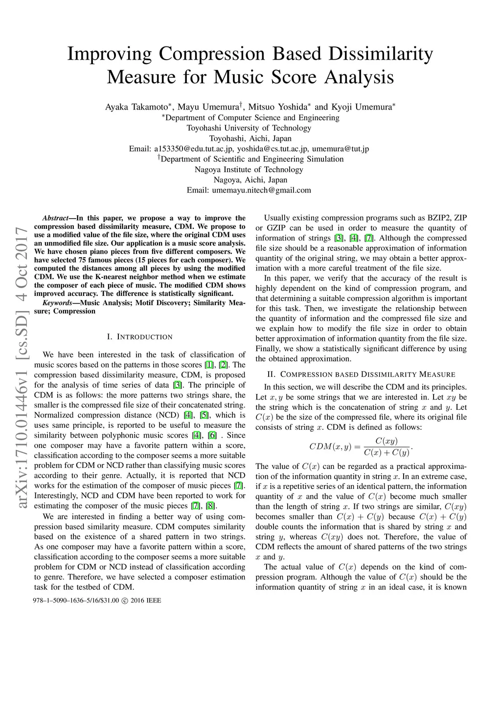 In this paper, we propose a way to improve the compression based dissimilarity measure, CDM. We propose to use a modified value of the file size, where the original CDM uses an unmodified file size. Our application is a music score analysis. We have chosen piano pieces from five different composers. We have selected 75 famous pieces (15 pieces for each composer). We computed the distances among all pieces by using the modified CDM. We use the K-nearest neighbor method when we estimate the composer of each piece of music. The modified CDM shows improved accuracy. The difference is statistically significant.