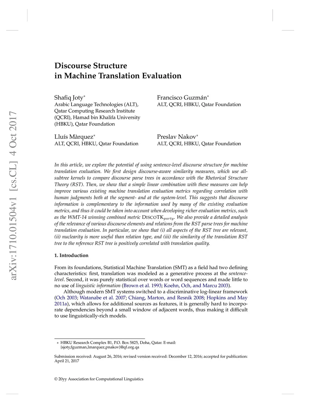 Discourse Structure in Machine Translation Evaluation
