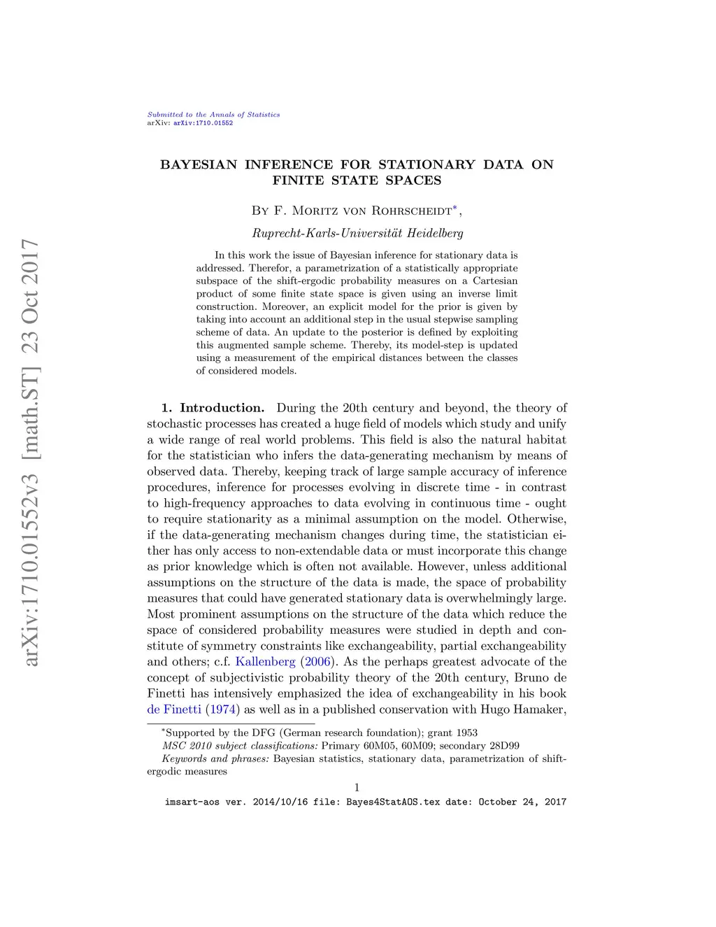 In this work the issue of Bayesian inference for stationary data is addressed. Therefor a parametrization of a statistically suitable subspace of the the shift-ergodic probability measures on a Cartesian product of some finite state space is given using an inverse limit construction. Moreover, an explicit model for the prior is given by taking into account an additional step in the usual stepwise sampling scheme of data. An update to the posterior is defined by exploiting this augmented sample scheme. Thereby, its model-step is updated using a measurement of the empirical distances between the model classes.