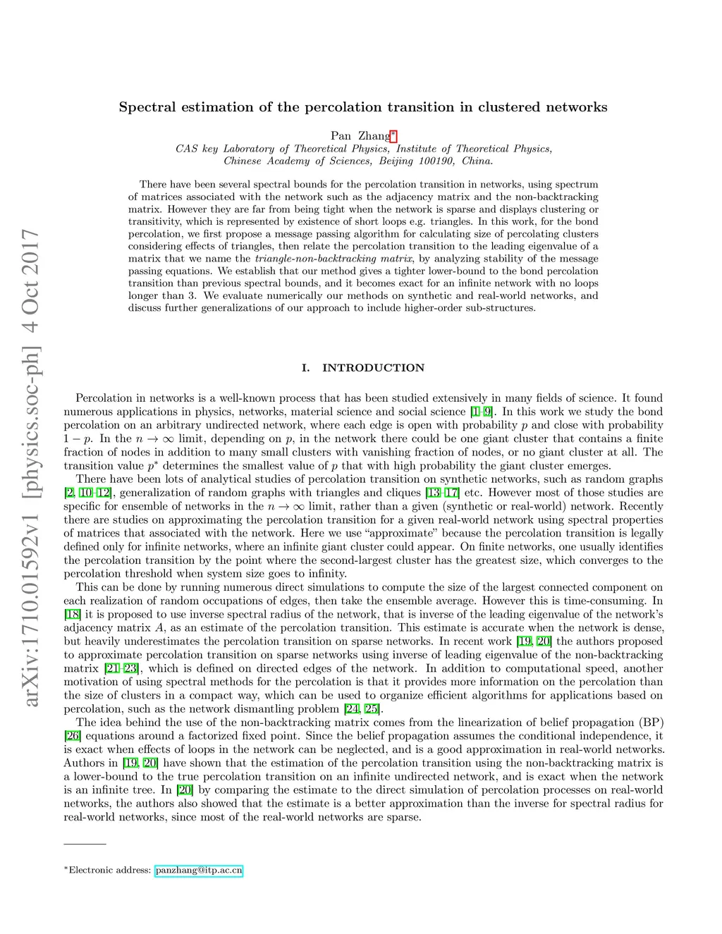 There have been several spectral bounds for the percolation transition in networks, using spectrum of matrices associated with the network such as the adjacency matrix and the non-backtracking matrix. However they are far from being tight when the network is sparse and displays clustering or transitivity, which is represented by existence of short loops e.g. triangles. In this work, for the bond percolation, we first propose a message passing algorithm for calculating size of percolating clusters considering effects of triangles, then relate the percolation transition to the leading eigenvalue of a matrix that we name the triangle-non-backtracking matrix, by analyzing stability of the message passing equations. We establish that our method gives a tighter lower-bound to the bond percolation transition than previous spectral bounds, and it becomes exact for an infinite network with no loops longer than 3. We evaluate numerically our methods on synthetic and real-world networks, and discuss further generalizations of our approach to include higher-order sub-structures.
