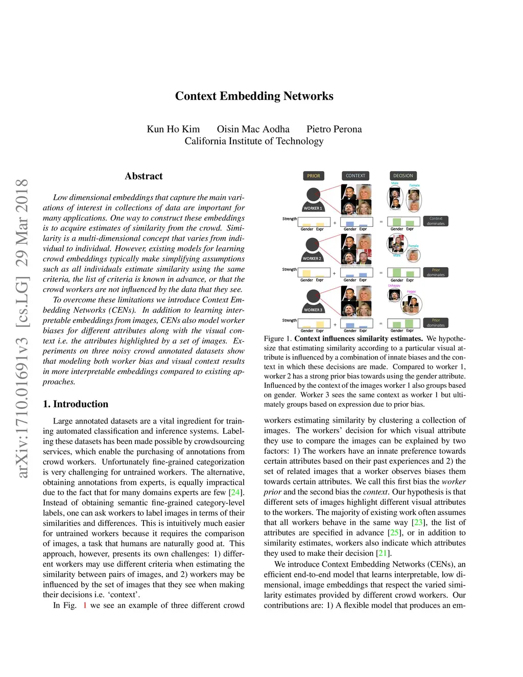 Low dimensional embeddings that capture the main variations of interest in collections of data are important for many applications. One way to construct these embeddings is to acquire estimates of similarity from the crowd. However, similarity is a multi-dimensional concept that varies from individual to individual. Existing models for learning embeddings from the crowd typically make simplifying assumptions such as all individuals estimate similarity using the same criteria, the list of criteria is known in advance, or that the crowd workers are not influenced by the data that they see. To overcome these limitations we introduce Context Embedding Networks (CENs). In addition to learning interpretable embeddings from images, CENs also model worker biases for different attributes along with the visual context i.e. the visual attributes highlighted by a set of images. Experiments on two noisy crowd annotated datasets show that modeling both worker bias and visual context results in more interpretable embeddings compared to existing approaches.