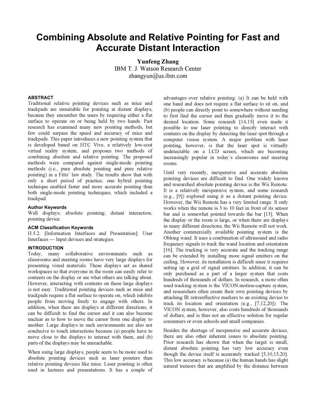 Traditional relative pointing devices such as mice and trackpads are unsuitable for pointing at distant displays, because they encumber the users by requiring either a flat surface to operate on or being held by two hands. Past research has examined many new pointing methods, but few could surpass the speed and accuracy of mice and trackpads. This paper introduces a new pointing system that is developed based on HTC Vive, a relatively low-cost virtual reality system, and proposes two methods of combining absolute and relative pointing. The proposed methods were compared against single-mode pointing methods (i.e., pure absolute pointing and pure relative pointing) in a Fitts' law study. The results show that with only a short period of practice, one hybrid pointing technique enabled faster and more accurate pointing than both single-mode pointing techniques, which included a trackpad.