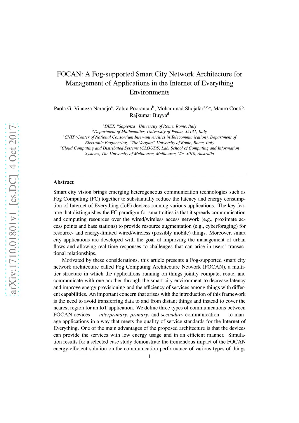 Smart city vision brings emerging heterogeneous communication technologies such as Fog Computing (FC) together to substantially reduce the latency and energy consumption of Internet of Everything (IoE) devices running various applications. The key feature that distinguishes the FC paradigm for smart cities is that it spreads communication and computing resources over the wired/wireless access network (e.g., proximate access points and base stations) to provide resource augmentation (e.g., cyberforaging) for resource and energy-limited wired/wireless (possibly mobile) things. Moreover, smart city applications are developed with the goal of improving the management of urban flows and allowing real-time responses to challenges that can arise in users' transactional relationships. This article presents a Fog-supported smart city network architecture called Fog Computing Architecture Network (FOCAN), a multi-tier structure in which the applications running on things jointly compute, route, and communicate with one another through the smart city environment to decrease latency and improve energy provisioning and the efficiency of services among things with different capabilities. An important concern that arises with the introduction of FOCAN is the need to avoid transferring data to/from distant things and instead to cover the nearest region for an IoT application. We define three types of communications between FOCAN devices (e.g., interprimary, primary, and secondary communication) to manage applications in a way that meets the quality of service standards for the IoE. One of the main advantages of FOCAN is that the devices can provide the services with low energy usage and in an efficient manner. Simulation results for a selected case study demonstrate the tremendous impact of the FOCAN energy-efficient solution on the communication performance of various types of things in smart cities.