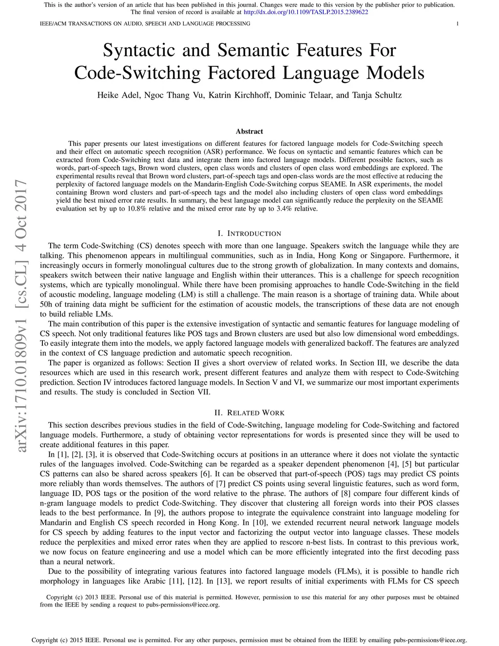 Syntactic and Semantic Features For Code-Switching Factored Language
