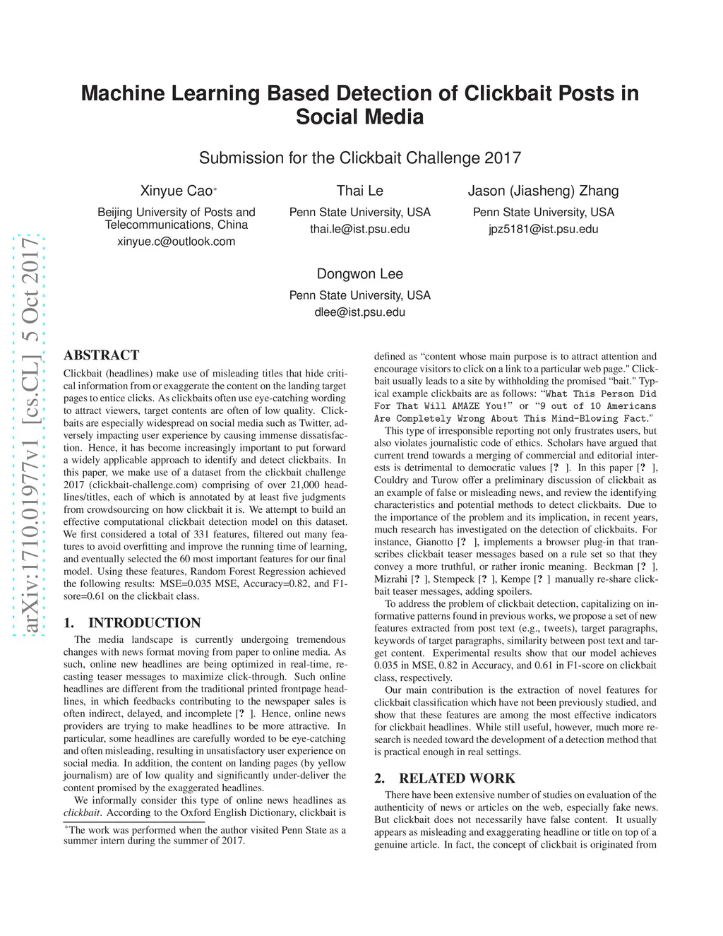 Clickbait (headlines) make use of misleading titles that hide critical information from or exaggerate the content on the landing target pages to entice clicks. As clickbaits often use eye-catching wording to attract viewers, target contents are often of low quality. Clickbaits are especially widespread on social media such as Twitter, adversely impacting user experience by causing immense dissatisfaction. Hence, it has become increasingly important to put forward a widely applicable approach to identify and detect clickbaits. In this paper, we make use of a dataset from the clickbait challenge 2017 (clickbait-challenge.com) comprising of over 21,000 headlines/titles, each of which is annotated by at least five judgments from crowdsourcing on how clickbait it is. We attempt to build an effective computational clickbait detection model on this dataset. We first considered a total of 331 features, filtered out many features to avoid overfitting and improve the running time of learning, and eventually selected the 60 most important features for our final model. Using these features, Random Forest Regression achieved the following results: MSE=0.035 MSE, Accuracy=0.82, and F1-sore=0.61 on the clickbait class.