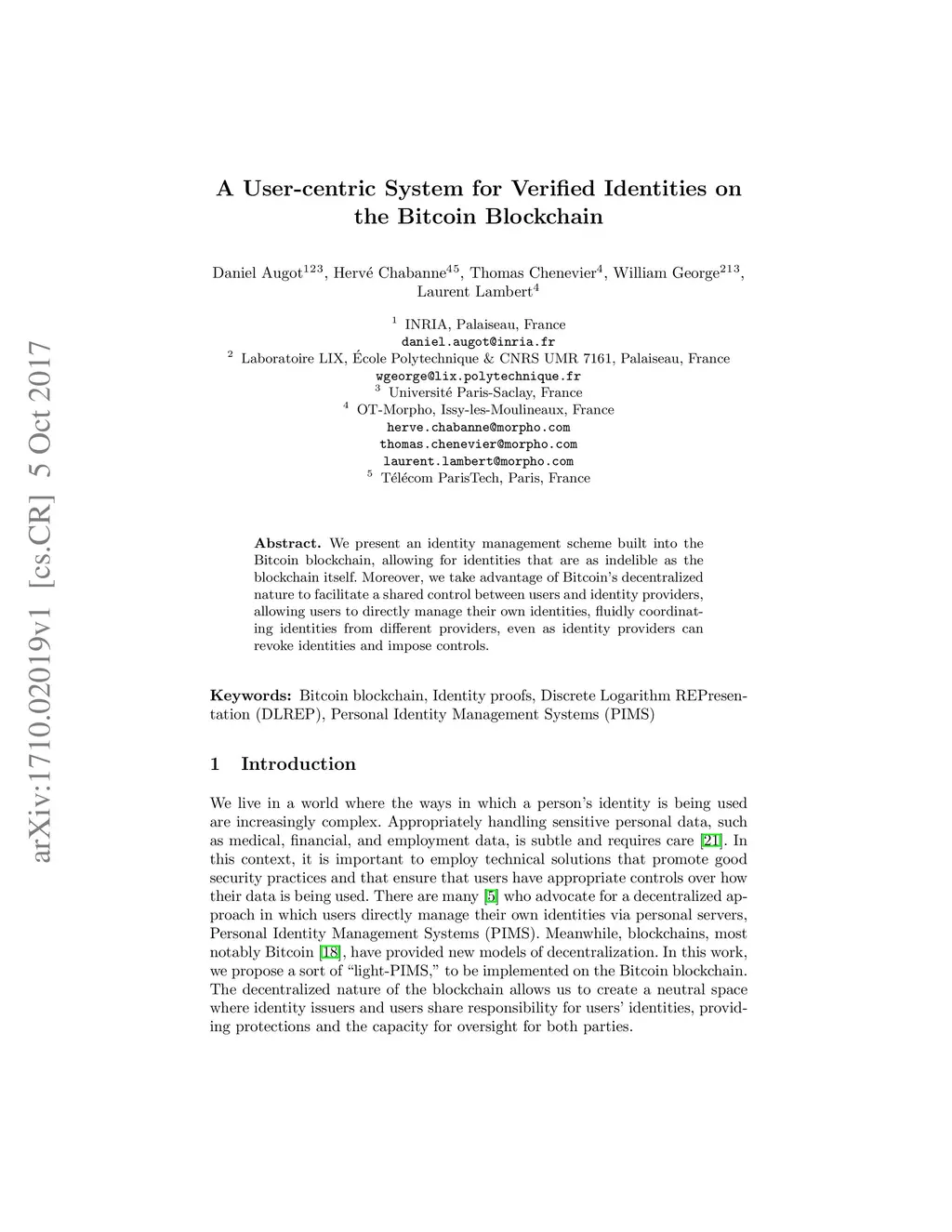 We present an identity management scheme built into the Bitcoin blockchain, allowing for identities that are as indelible as the blockchain itself. Moreover, we take advantage of Bitcoin's decentralized nature to facilitate a shared control between users and identity providers, allowing users to directly manage their own identities, fluidly coordinating identities from different providers, even as identity providers can revoke identities and impose controls.