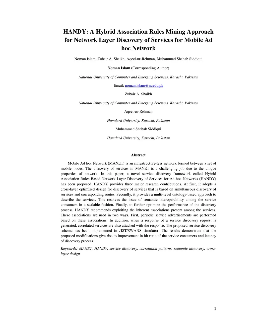 Mobile Ad hoc Network (MANET) is an infrastructure-less network formed between a set of mobile nodes. The discovery of services in MANET is a challenging job due to the unique properties of network. In this paper, a novel service discovery framework called Hybrid Association Rules Based Network Layer Discovery of Services for Ad hoc Networks (HANDY) has been proposed. HANDY provides three major research contributions. At first, it adopts a cross-layer optimized design for discovery of services that is based on simultaneous discovery of services and corresponding routes. Secondly, it provides a multi-level ontology-based approach to describe the services. This resolves the issue of semantic interoperability among the service consumers in a scalable fashion. Finally, to further optimize the performance of the discovery process, HANDY recommends exploiting the inherent associations present among the services. These associations are used in two ways. First, periodic service advertisements are performed based on these associations. In addition, when a response of a service discovery request is generated, correlated services are also attached with the response. The proposed service discovery scheme has been implemented in JIST/SWANS simulator. The results demonstrate that the proposed modifications give rise to improvement in hit ratio of the service consumers and latency of discovery process.