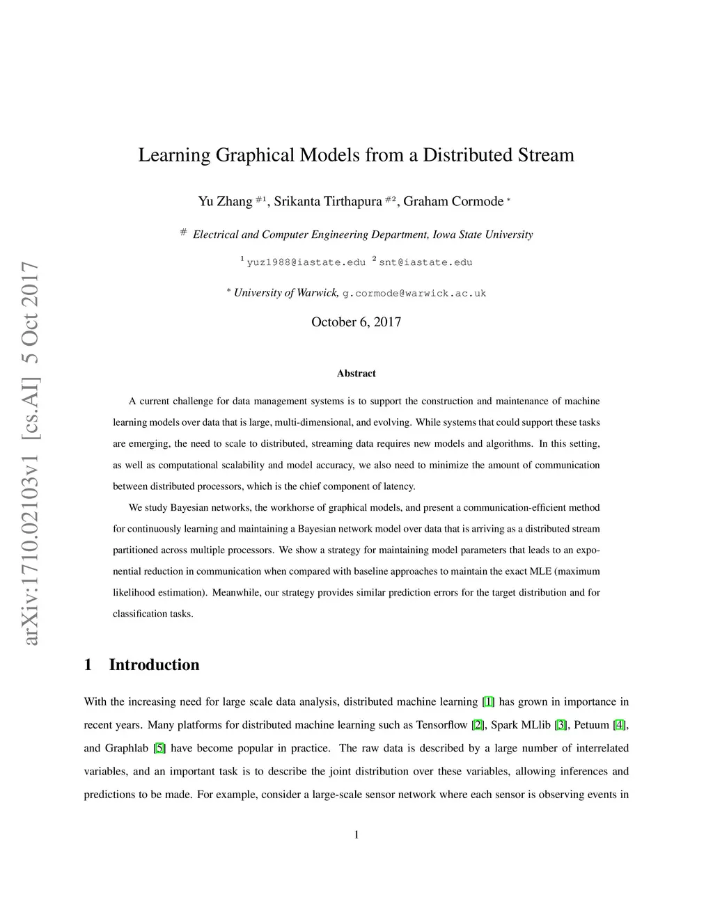 A current challenge for data management systems is to support the construction and maintenance of machine learning models over data that is large, multi-dimensional, and evolving. While systems that could support these tasks are emerging, the need to scale to distributed, streaming data requires new models and algorithms. In this setting, as well as computational scalability and model accuracy, we also need to minimize the amount of communication between distributed processors, which is the chief component of latency. We study Bayesian networks, the workhorse of graphical models, and present a communication-efficient method for continuously learning and maintaining a Bayesian network model over data that is arriving as a distributed stream partitioned across multiple processors. We show a strategy for maintaining model parameters that leads to an exponential reduction in communication when compared with baseline approaches to maintain the exact MLE (maximum likelihood estimation). Meanwhile, our strategy provides similar prediction errors for the target distribution and for classification tasks.
