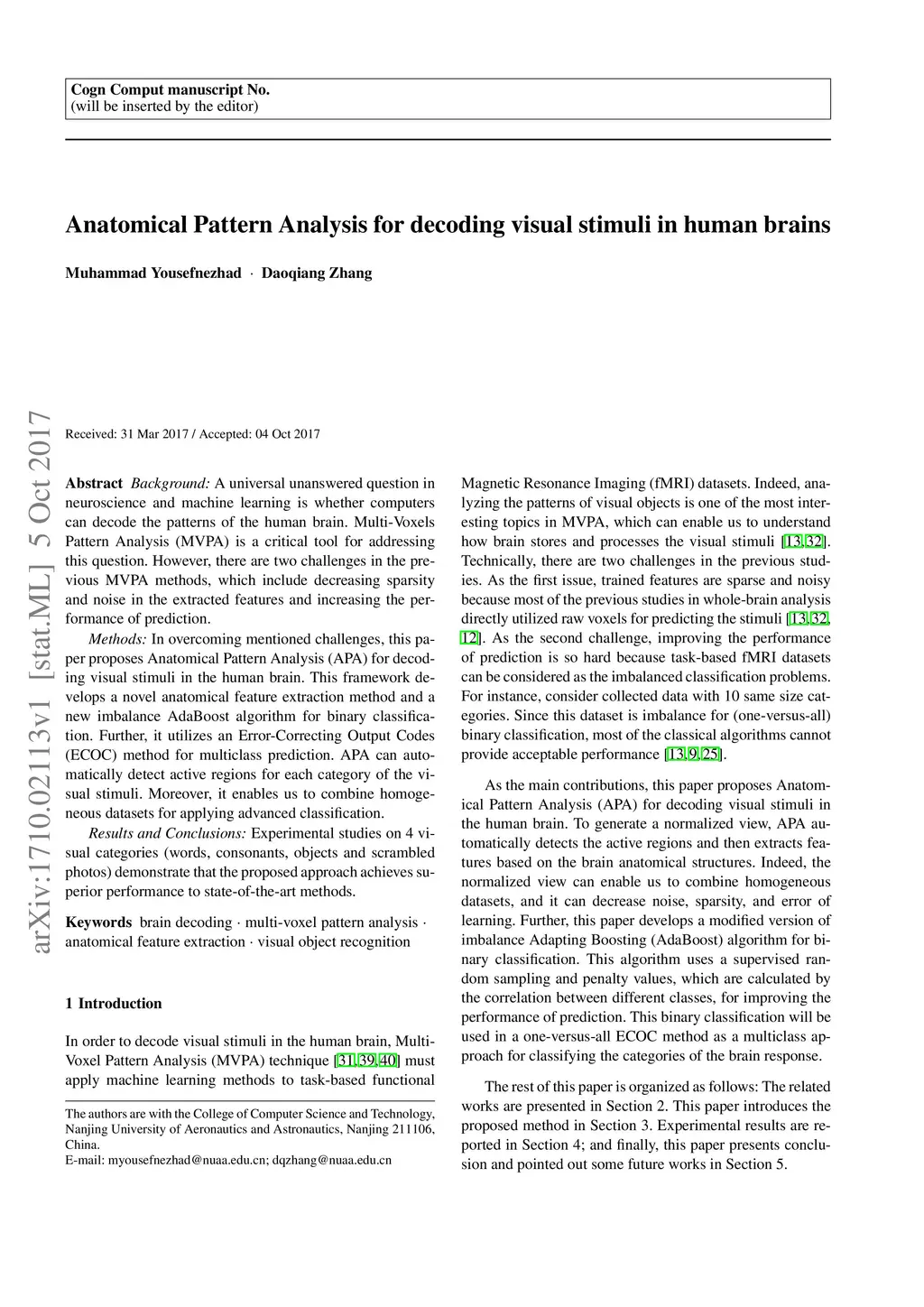 Background: A universal unanswered question in neuroscience and machine learning is whether computers can decode the patterns of the human brain. Multi-Voxels Pattern Analysis (MVPA) is a critical tool for addressing this question. However, there are two challenges in the previous MVPA methods, which include decreasing sparsity and noise in the extracted features and increasing the performance of prediction. Methods: In overcoming mentioned challenges, this paper proposes Anatomical Pattern Analysis (APA) for decoding visual stimuli in the human brain. This framework develops a novel anatomical feature extraction method and a new imbalance AdaBoost algorithm for binary classification. Further, it utilizes an Error-Correcting Output Codes (ECOC) method for multiclass prediction. APA can automatically detect active regions for each category of the visual stimuli. Moreover, it enables us to combine homogeneous datasets for applying advanced classification. Results and Conclusions: Experimental studies on 4 visual categories (words, consonants, objects and scrambled photos) demonstrate that the proposed approach achieves superior performance to state-of-the-art methods.