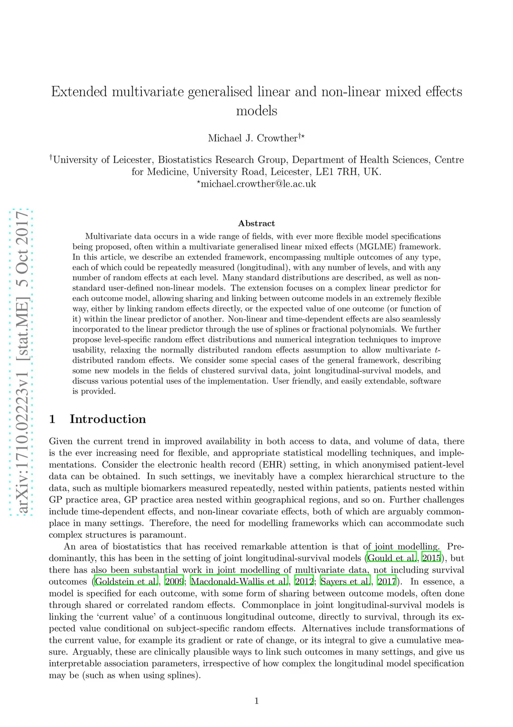 Multivariate data occurs in a wide range of fields, with ever more flexible model specifications being proposed, often within a multivariate generalised linear mixed effects (MGLME) framework. In this article, we describe an extended framework, encompassing multiple outcomes of any type, each of which could be repeatedly measured (longitudinal), with any number of levels, and with any number of random effects at each level. Many standard distributions are described, as well as non-standard user-defined non-linear models. The extension focuses on a complex linear predictor for each outcome model, allowing sharing and linking between outcome models in an extremely flexible way, either by linking random effects directly, or the expected value of one outcome (or function of it) within the linear predictor of another. Non-linear and time-dependent effects are also seamlessly incorporated to the linear predictor through the use of splines or fractional polynomials. We further propose level-specific random effect distributions and numerical integration techniques to improve usability, relaxing the normally distributed random effects assumption to allow multivariate -distributed random effects. We consider some special cases of the general framework, describing some new models in the fields of clustered survival data, joint longitudinal-survival models, and discuss various potential uses of the implementation. User friendly, and easily extendable, software is provided.
