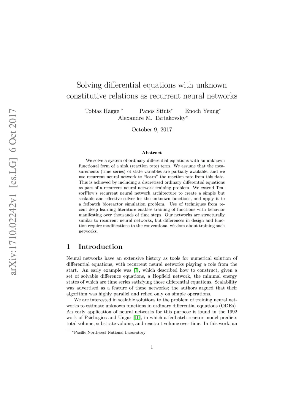 We solve a system of ordinary differential equations with an unknown functional form of a sink (reaction rate) term. We assume that the measurements (time series) of state variables are partially available, and we use recurrent neural network to "learn" the reaction rate from this data. This is achieved by including a discretized ordinary differential equations as part of a recurrent neural network training problem. We extend TensorFlow's recurrent neural network architecture to create a simple but scalable and effective solver for the unknown functions, and apply it to a fedbatch bioreactor simulation problem. Use of techniques from recent deep learning literature enables training of functions with behavior manifesting over thousands of time steps. Our networks are structurally similar to recurrent neural networks, but differences in design and function require modifications to the conventional wisdom about training such networks.
