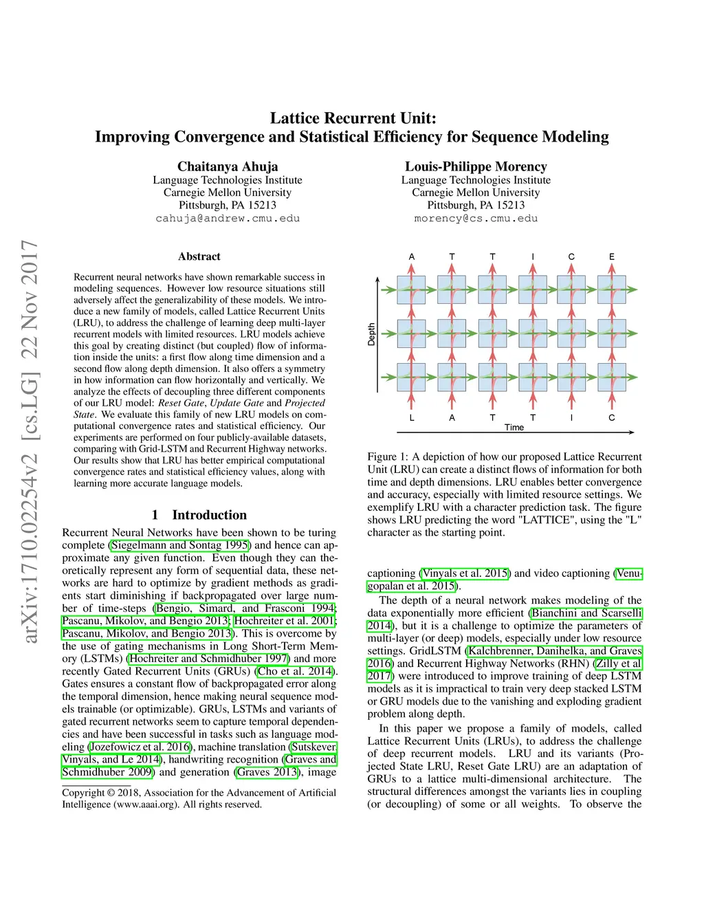 Recurrent neural networks have shown remarkable success in modeling sequences. However low resource situations still adversely affect the generalizability of these models. We introduce a new family of models, called Lattice Recurrent Units (LRU), to address the challenge of learning deep multi-layer recurrent models with limited resources. LRU models achieve this goal by creating distinct (but coupled) flow of information inside the units: a first flow along time dimension and a second flow along depth dimension. It also offers a symmetry in how information can flow horizontally and vertically. We analyze the effects of decoupling three different components of our LRU model: Reset Gate, Update Gate and Projected State. We evaluate this family on new LRU models on computational convergence rates and statistical efficiency. Our experiments are performed on four publicly-available datasets, comparing with Grid-LSTM and Recurrent Highway networks. Our results show that LRU has better empirical computational convergence rates and statistical efficiency values, along with learning more accurate language models.