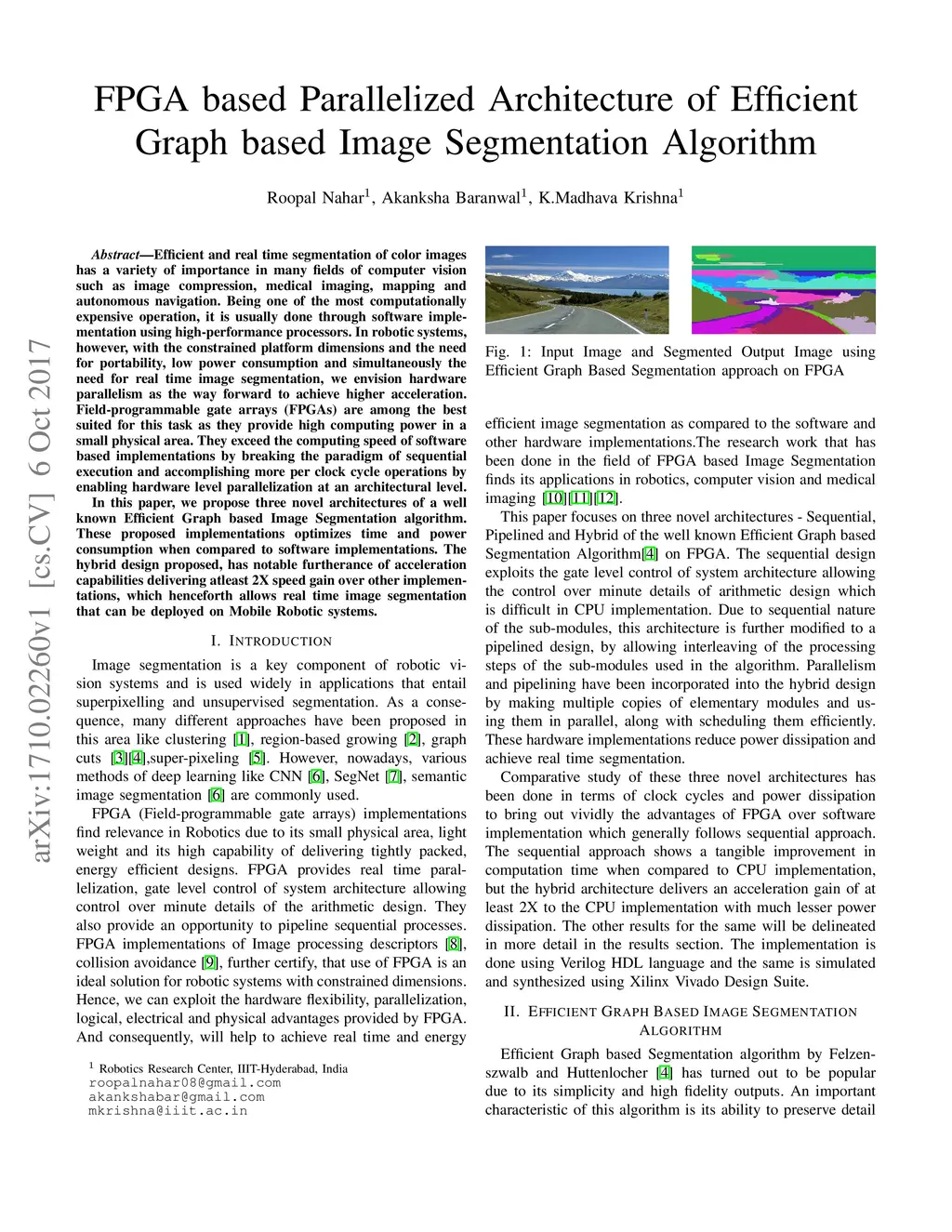Efficient and real time segmentation of color images has a variety of importance in many fields of computer vision such as image compression, medical imaging, mapping and autonomous navigation. Being one of the most computationally expensive operation, it is usually done through software imple- mentation using high-performance processors. In robotic systems, however, with the constrained platform dimensions and the need for portability, low power consumption and simultaneously the need for real time image segmentation, we envision hardware parallelism as the way forward to achieve higher acceleration. Field-programmable gate arrays (FPGAs) are among the best suited for this task as they provide high computing power in a small physical area. They exceed the computing speed of software based implementations by breaking the paradigm of sequential execution and accomplishing more per clock cycle operations by enabling hardware level parallelization at an architectural level. In this paper, we propose three novel architectures of a well known Efficient Graph based Image Segmentation algorithm. These proposed implementations optimizes time and power consumption when compared to software implementations. The hybrid design proposed, has notable furtherance of acceleration capabilities delivering atleast 2X speed gain over other implemen- tations, which henceforth allows real time image segmentation that can be deployed on Mobile Robotic systems.