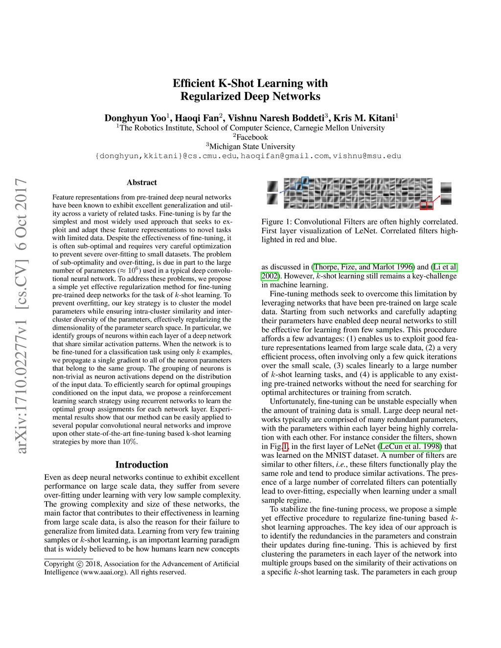Feature representations from pre-trained deep neural networks have been known to exhibit excellent generalization and utility across a variety of related tasks. Fine-tuning is by far the simplest and most widely used approach that seeks to exploit and adapt these feature representations to novel tasks with limited data. Despite the effectiveness of fine-tuning, itis often sub-optimal and requires very careful optimization to prevent severe over-fitting to small datasets. The problem of sub-optimality and over-fitting, is due in part to the large number of parameters used in a typical deep convolutional neural network. To address these problems, we propose a simple yet effective regularization method for fine-tuning pre-trained deep networks for the task of k-shot learning. To prevent overfitting, our key strategy is to cluster the model parameters while ensuring intra-cluster similarity and inter-cluster diversity of the parameters, effectively regularizing the dimensionality of the parameter search space. In particular, we identify groups of neurons within each layer of a deep network that shares similar activation patterns. When the network is to be fine-tuned for a classification task using only k examples, we propagate a single gradient to all of the neuron parameters that belong to the same group. The grouping of neurons is non-trivial as neuron activations depend on the distribution of the input data. To efficiently search for optimal groupings conditioned on the input data, we propose a reinforcement learning search strategy using recurrent networks to learn the optimal group assignments for each network layer. Experimental results show that our method can be easily applied to several popular convolutional neural networks and improve upon other state-of-the-art fine-tuning based k-shot learning strategies by more than10%