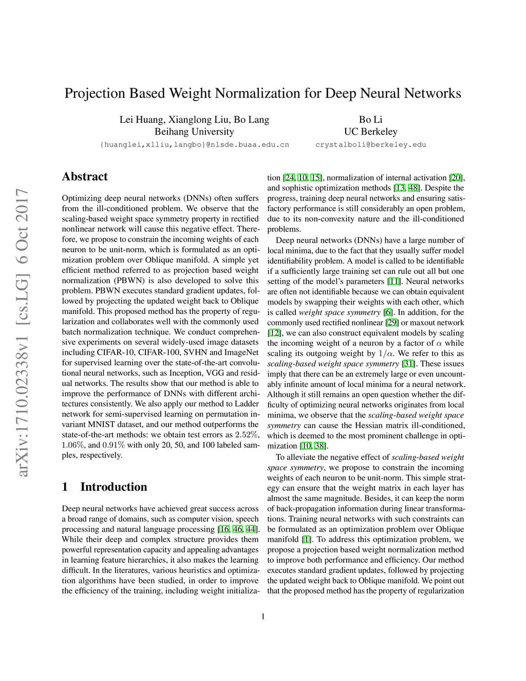 Optimizing deep neural networks (DNNs) often suffers from the ill-conditioned problem. We observe that the scaling-based weight space symmetry property in rectified nonlinear network will cause this negative effect. Therefore, we propose to constrain the incoming weights of each neuron to be unit-norm, which is formulated as an optimization problem over Oblique manifold. A simple yet efficient method referred to as projection based weight normalization (PBWN) is also developed to solve this problem. PBWN executes standard gradient updates, followed by projecting the updated weight back to Oblique manifold. This proposed method has the property of regularization and collaborates well with the commonly used batch normalization technique. We conduct comprehensive experiments on several widely-used image datasets including CIFAR-10, CIFAR-100, SVHN and ImageNet for supervised learning over the state-of-the-art convolutional neural networks, such as Inception, VGG and residual networks. The results show that our method is able to improve the performance of DNNs with different architectures consistently. We also apply our method to Ladder network for semi-supervised learning on permutation invariant MNIST dataset, and our method outperforms the state-of-the-art methods: we obtain test errors as 2.52%, 1.06%, and 0.91% with only 20, 50, and 100 labeled samples, respectively.