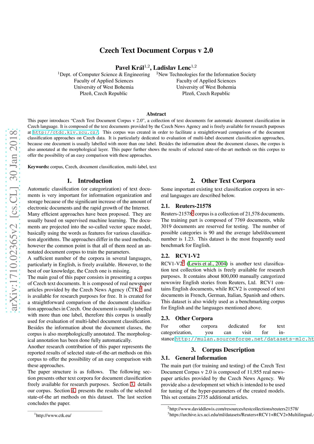 This paper introduces "Czech Text Document Corpus v 2.0", a collection of text documents for automatic document classification in Czech language. It is composed of the text documents provided by the Czech News Agency and is freely available for research purposes at http://ctdc.kiv.zcu.cz/. This corpus was created in order to facilitate a straightforward comparison of the document classification approaches on Czech data. It is particularly dedicated to evaluation of multi-label document classification approaches, because one document is usually labelled with more than one label. Besides the information about the document classes, the corpus is also annotated at the morphological layer. This paper further shows the results of selected state-of-the-art methods on this corpus to offer the possibility of an easy comparison with these approaches.
