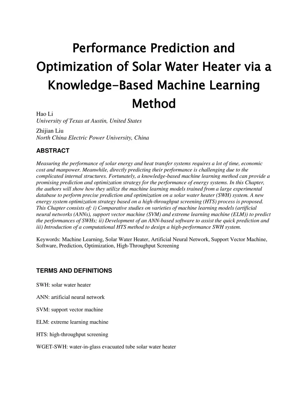 Measuring the performance of solar energy and heat transfer systems requires a lot of time, economic cost and manpower. Meanwhile, directly predicting their performance is challenging due to the complicated internal structures. Fortunately, a knowledge-based machine learning method can provide a promising prediction and optimization strategy for the performance of energy systems. In this Chapter, the authors will show how they utilize the machine learning models trained from a large experimental database to perform precise prediction and optimization on a solar water heater (SWH) system. A new energy system optimization strategy based on a high-throughput screening (HTS) process is proposed. This Chapter consists of: i) Comparative studies on varieties of machine learning models (artificial neural networks (ANNs), support vector machine (SVM) and extreme learning machine (ELM)) to predict the performances of SWHs; ii) Development of an ANN-based software to assist the quick prediction and iii) Introduction of a computational HTS method to design a high-performance SWH system.