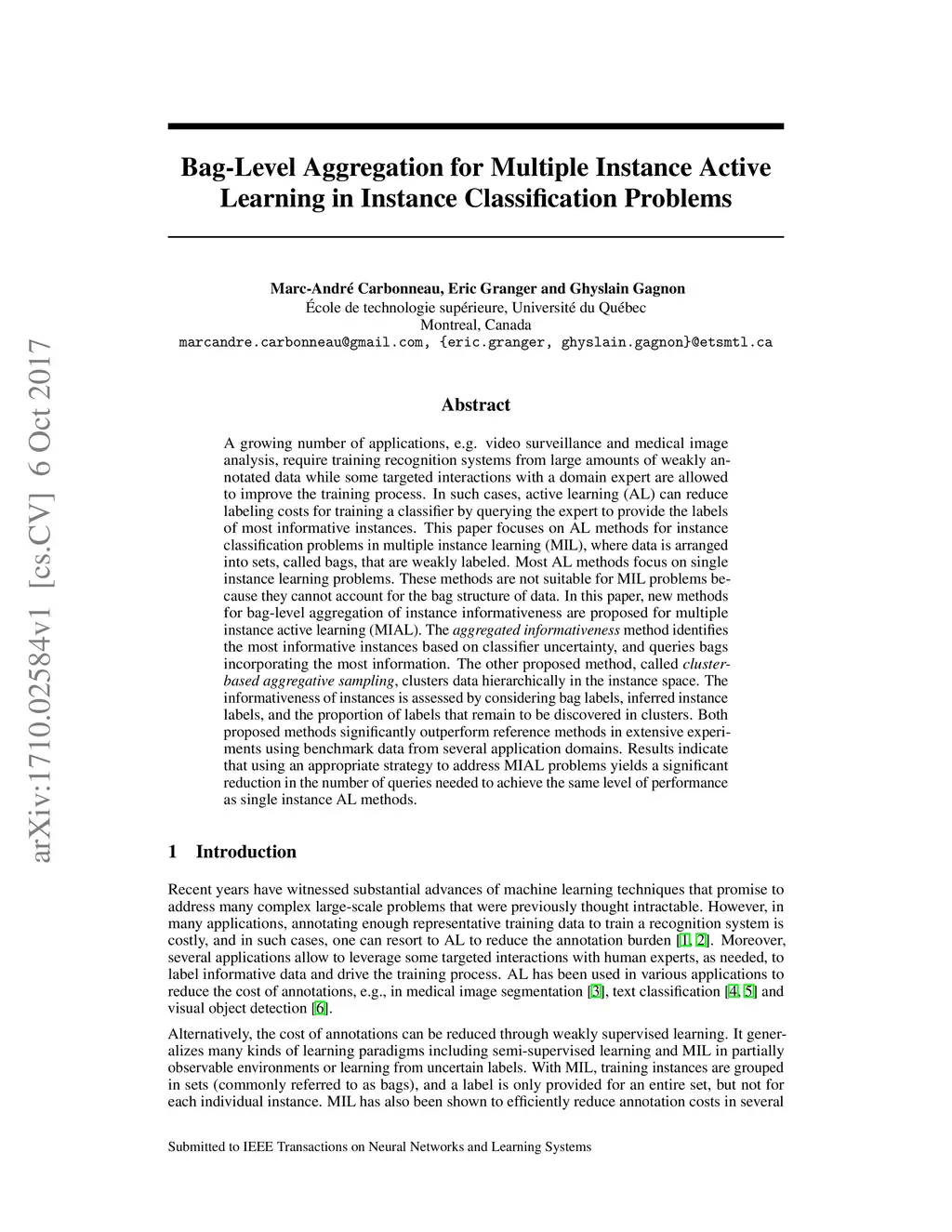 A growing number of applications, e.g. video surveillance and medical image analysis, require training recognition systems from large amounts of weakly annotated data while some targeted interactions with a domain expert are allowed to improve the training process. In such cases, active learning (AL) can reduce labeling costs for training a classifier by querying the expert to provide the labels of most informative instances. This paper focuses on AL methods for instance classification problems in multiple instance learning (MIL), where data is arranged into sets, called bags, that are weakly labeled. Most AL methods focus on single instance learning problems. These methods are not suitable for MIL problems because they cannot account for the bag structure of data. In this paper, new methods for bag-level aggregation of instance informativeness are proposed for multiple instance active learning (MIAL). The \textit{aggregated informativeness} method identifies the most informative instances based on classifier uncertainty, and queries bags incorporating the most information. The other proposed method, called \textit{cluster-based aggregative sampling}, clusters data hierarchically in the instance space. The informativeness of instances is assessed by considering bag labels, inferred instance labels, and the proportion of labels that remain to be discovered in clusters. Both proposed methods significantly outperform reference methods in extensive experiments using benchmark data from several application domains. Results indicate that using an appropriate strategy to address MIAL problems yields a significant reduction in the number of queries needed to achieve the same level of performance as single instance AL methods.